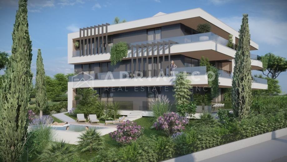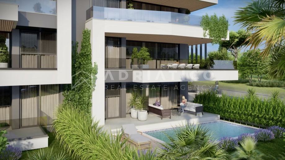 Rovinj, novogradnja, prodaje se stan u prizemlju s dvorištem i bazenom.
