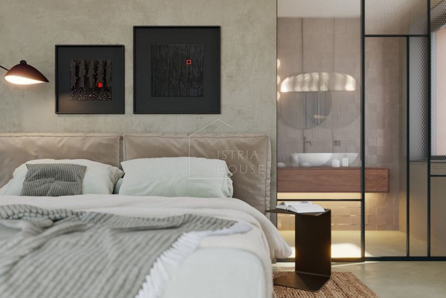 Na katu su smještene dvije velike spavaće sobe s vlastitim kupaonicama – jedna s izlazom na balkon, dok druga, preko staklene stijene, pruža pogled na bazen i okolnu prirodu.