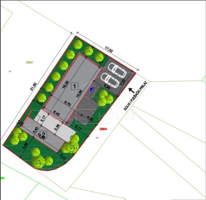 Okućnica je uređena u mediteranskom stilu, poštujući prirodu koja je okružuje, a osigurana su i dva parkirna mjesta.