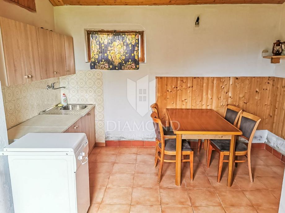 Na imanju se nalazi kuća sa nešto više od 60m2 te se sastoji od dnevnog dijela, prostorije sa kaminom, kuhinje, ostave/radione te kupaonice. Tlocrt same kuće je otvorenog tipa tako da se tu može dodati i spavaća soba. Struja je trenutačno izvedena preko solarnih panela, a voda putem cisterne koja se nalazi uz kuću.