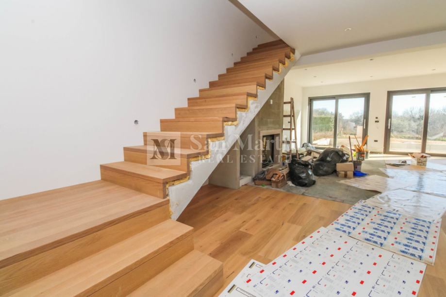 Grijanje i hlađenje je izvedeno putem visokokvalitetnih inverter klima uređaja, dok je u kupaonicama sprovedeno i podno grijanje. U dnevnom dijelu se smjestio i lijepi kamin sa ventilacijskim sustavom. Što se tiče materijala, podne obloge su kombinacija kvalitetnog parketa i pločica u kuhinji i kupaonicama. Stepenište koje vodi na kat je od hrasta.
