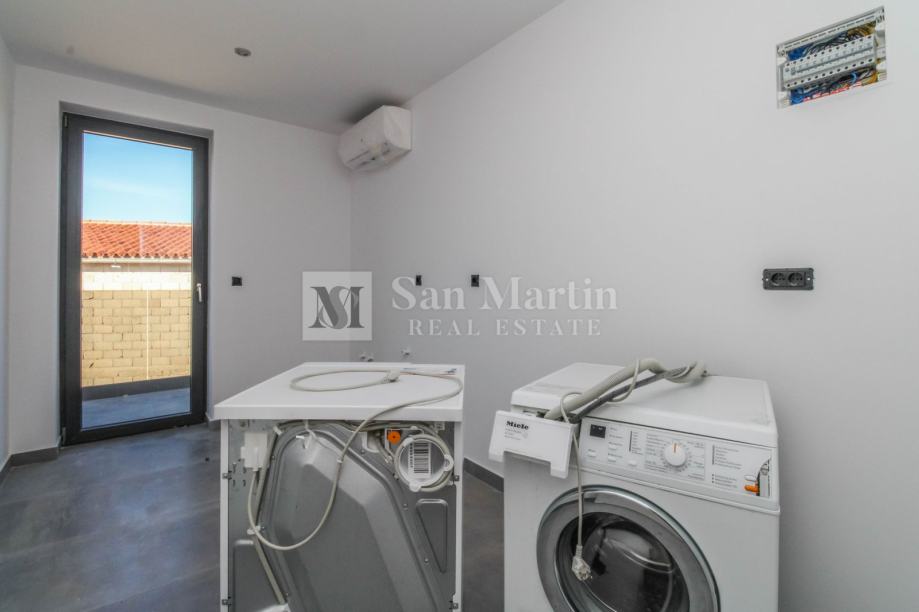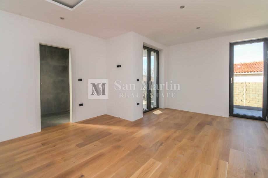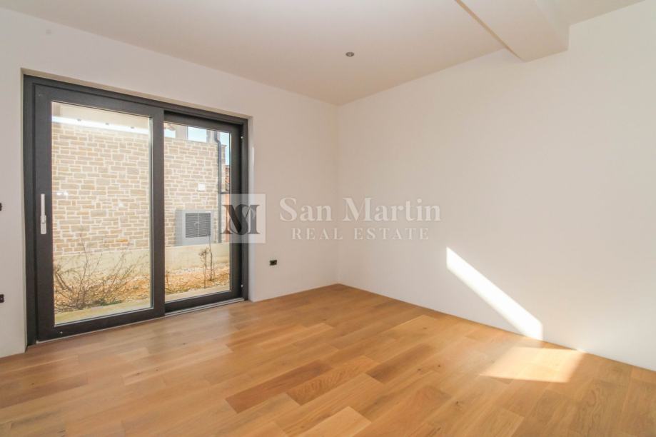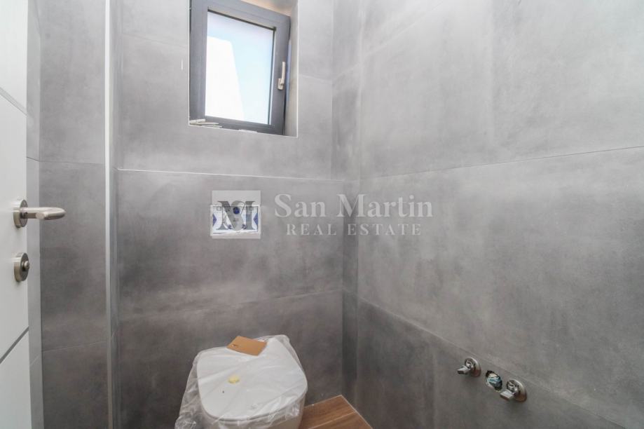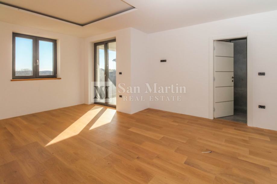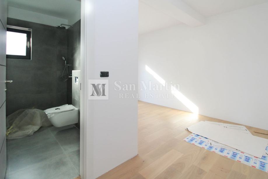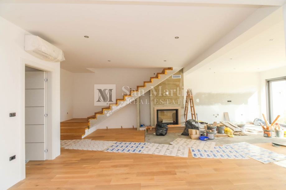 Sa ukupnom kvadraturom od 200 m2, prostire se kroz podrum, prizemlje i prvi kat. U prizemlju nailazimo ulazno predsoblje s toaletom, te na prostrani i svijetao open space koncept sa dnevnim boravkom, kuhinjom i blagovaonicom. Ovdje se također nalazi jedna spavaća soba s vlastitom kupaonicom te manja prostorija s tušem koja je predviđena da bude spa zona. Na katu su još dvije spavaće sobe s kupaonicama, radna soba te vešeraj.