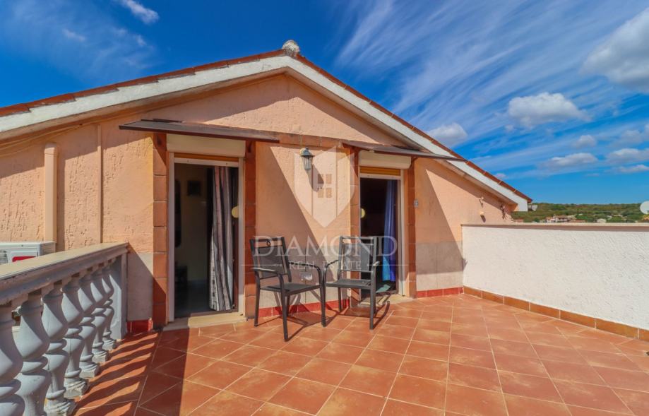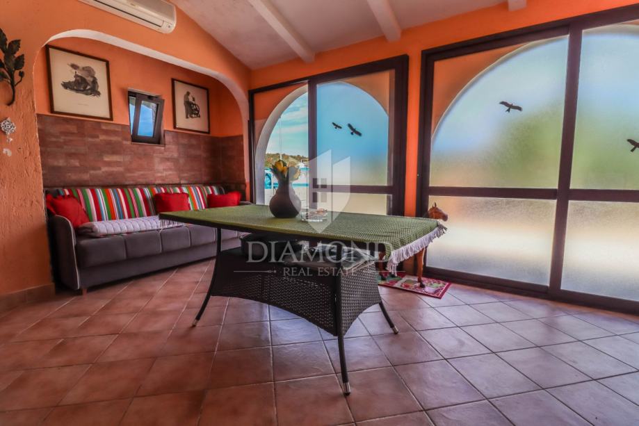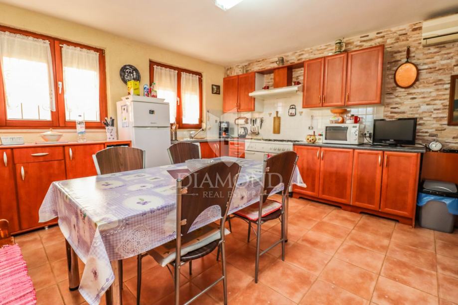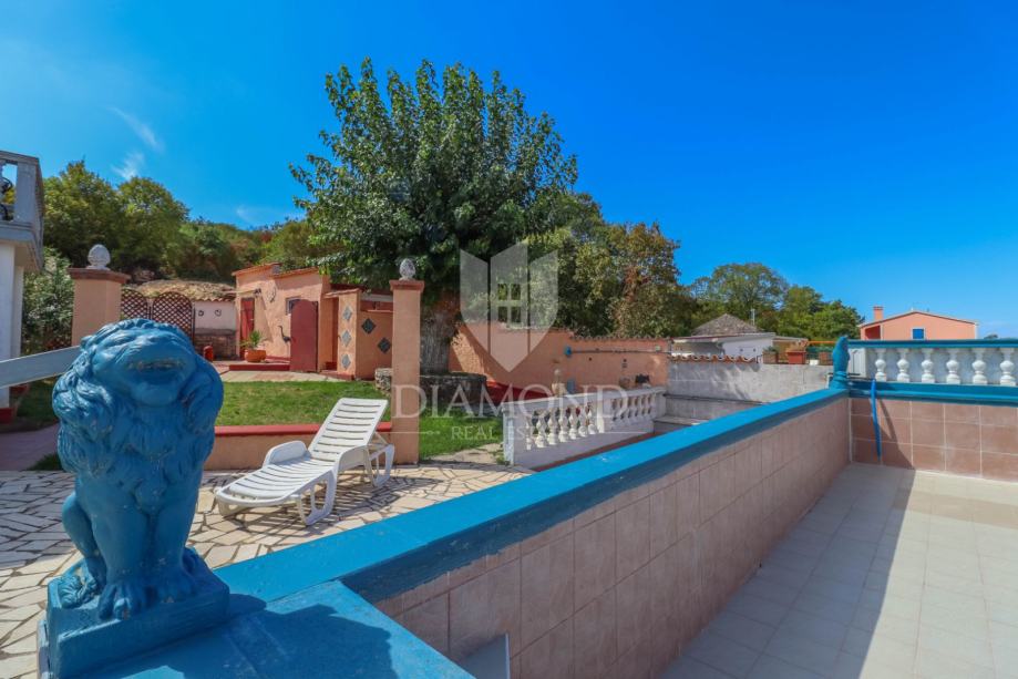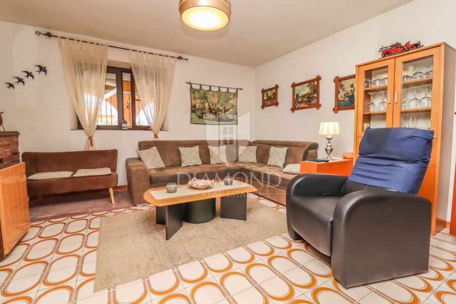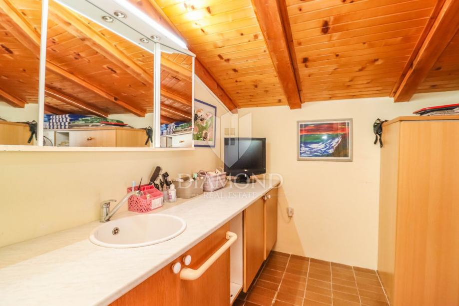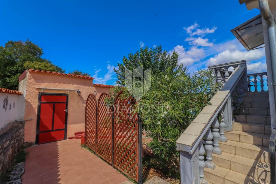 Ovo malo imanje se sastoji od kuće koja se proteže na dvije etaže sa 215m2, garaže, pomoćne građevine kao spremišta te prekrasnog ograđenog maslinika.
