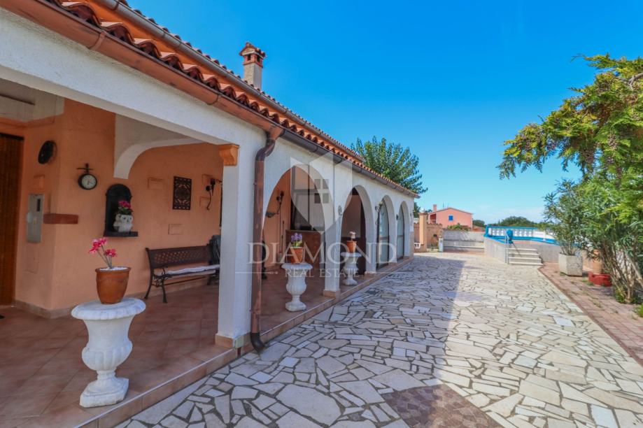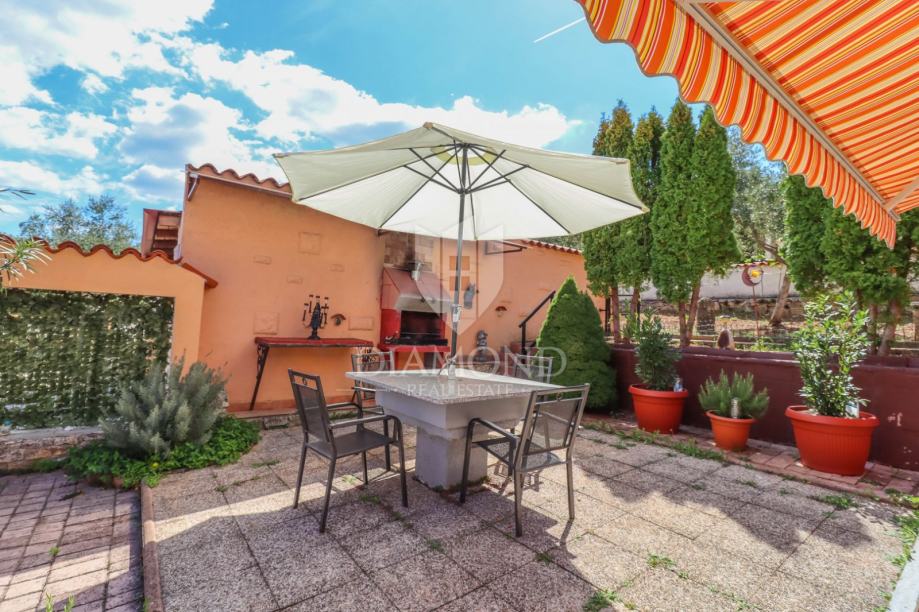 U sklopu okućnice nalazimo jednu veliku natkrivenu terasu pred kućom, vanjsku grill zonu te bazen. Kraj bazena nalazi se zatvoreni tuš, kao i spremište. Sve je lijepo i održavano te oplemenjeno sa raznim mediteranskim biljkama i stablima. Tu dolazimo do ograđenog maslinika koji je dovoljan za proizvodnju ulja za potrebe kućanstva, a među maslinama se našla i koja voćka kako bi zaokružila kompletu ponudu. Kuća u okućnici ima parkinga za više vozila, dok se u natkrivenoj garaži sa radionicom mogu komforno smjestiti dva vozila.