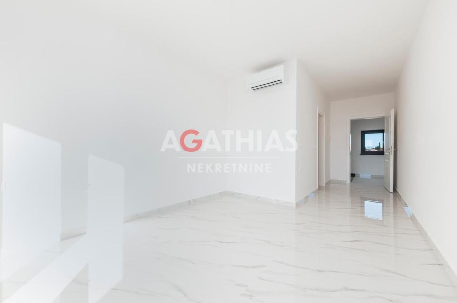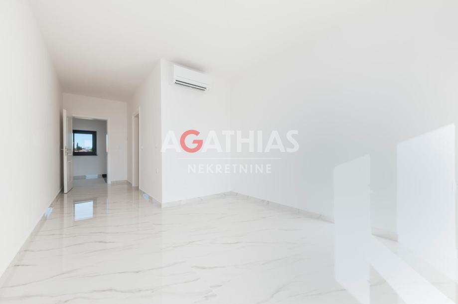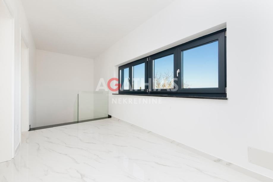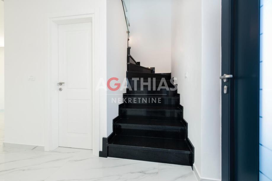 Kuća se prostire na dvije etaže. U prizemlju se nalazi prostrani dnevni boravak s kuhinjom i blagovaonicom, jedna spavaća soba, kupaonica, praktična ljetna kuhinja te natkrivena terasa, savršena za druženje u toplijim mjesecima. Kat kuće obuhvaća tri elegantno uređene spavaće sobe, tri moderne kupaonice, dvije lođe i nenatkrivenu terasu, nudeći privatnost i udobnost na svakom koraku.
