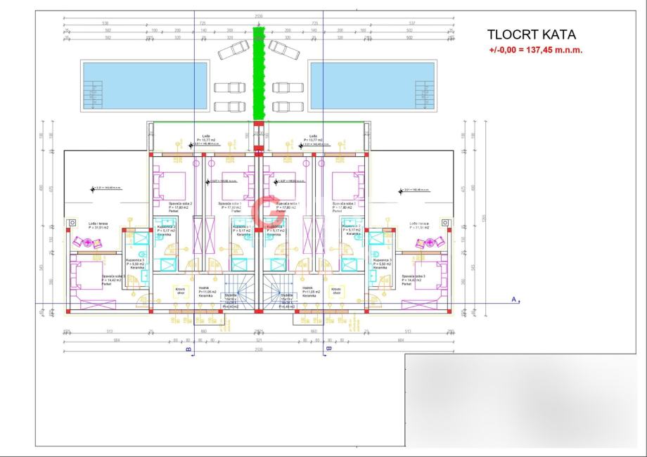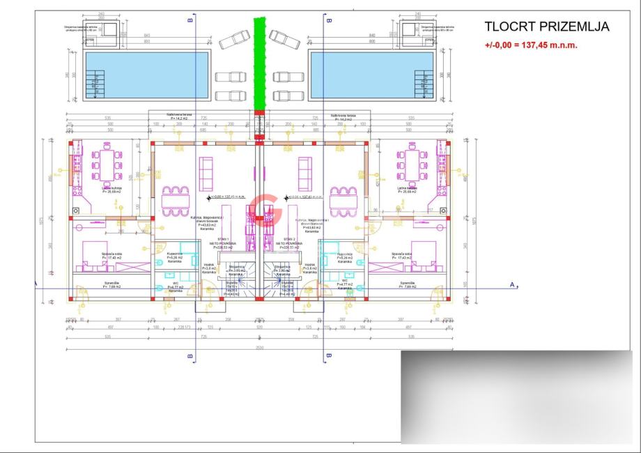 Na istočnoj strani parcele smješten je bazen dimenzija 8,4 x 3,4 m, okružen autohtonim zelenilom i popločanim površinama, stvarajući savršeno mjesto za opuštanje i uživanje na otvorenom. Parcela također uključuje osigurana vanjska parkirališna mjesta.