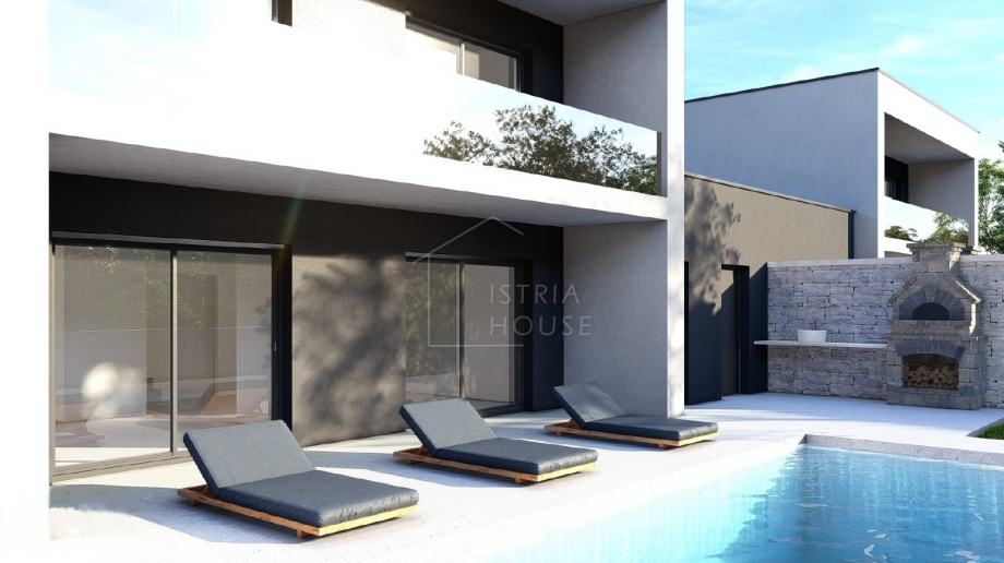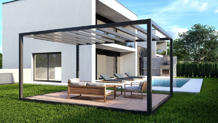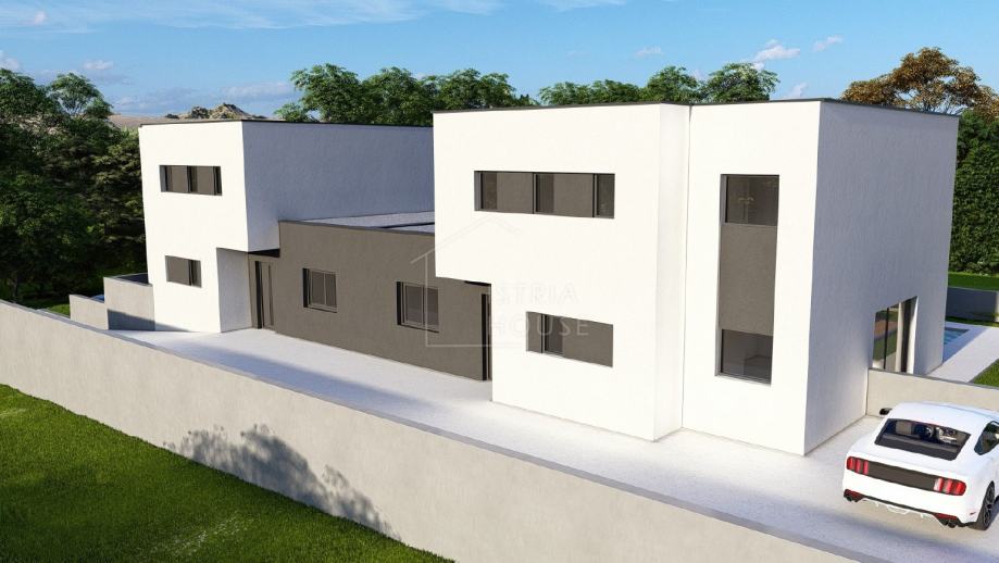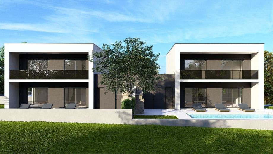 Prodaje se nova moderna kuća za odmor na traženoj lokaciji u okolici grada Rovinja. Kuća se nalazi na rubu građevinske zone, u mirnom naselju, okružena prirodom i zelenilom. Kuća je dvojna i trenutno je u izgradnji, a sastoji se od prizemlja i kata. U prizemlju se nalazi prostrani open space dnevni boravak s kuhinjom i blagovaonicom, jedna spavaća soba sa kupatilom, wc, ostava i prostrano spremište. Na katu se nalaze tri spavaće sobe sa izlazom na veliku terasu koja je orijentirana na južnu stranu te dva kupatila. U lijepo uređenom dvorištu nalazi se bazen sunčalištem te ljetna kuhinja s kaminom. Nekretnina će biti opremljena klima uređajima za grijanje i hlađenje te podnim grijanjem. Nekretnina će biti završena u drugoj polovici 2023. godine što daje vremena kupcu za odabir završnih materijala. U blizini kuće se nalaze trgovina, restorani, kafići, a na samo nekoliko minuta vožnje se nalazi i Rovinj sa svojim prekrasnim plažama.