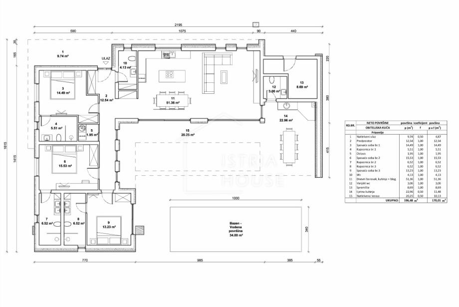 Villa ima ukupno 170 m2 a nalazi se na velikom zemljištu od približno 800 m2 što je idealna veličina za tako prekrasnu villu jer daje dovoljno prostora i privatnosti. Villa ima otvoreni dnevni boravak koji se spaja sa luksuznom kuhinjom i blagovaonom. Iz dnevnog boravka se izlazi na natkrivenu terasu koja u načelu funkcionira kao produžetak dnevnog boravka te tako veliki prostor čini još većim. Taj efekt je još više povećan jer su prisutne staklene stijene koje još više otvaraju prostor. Villa ima i tri spavaće sobe svaka sa svojim vlastitim kupatilom, uz to kuča ima i unutarnji wc, vanjski wc uz ljetnu kuhinju, unutarnju ostavu te vanjsko spremište..