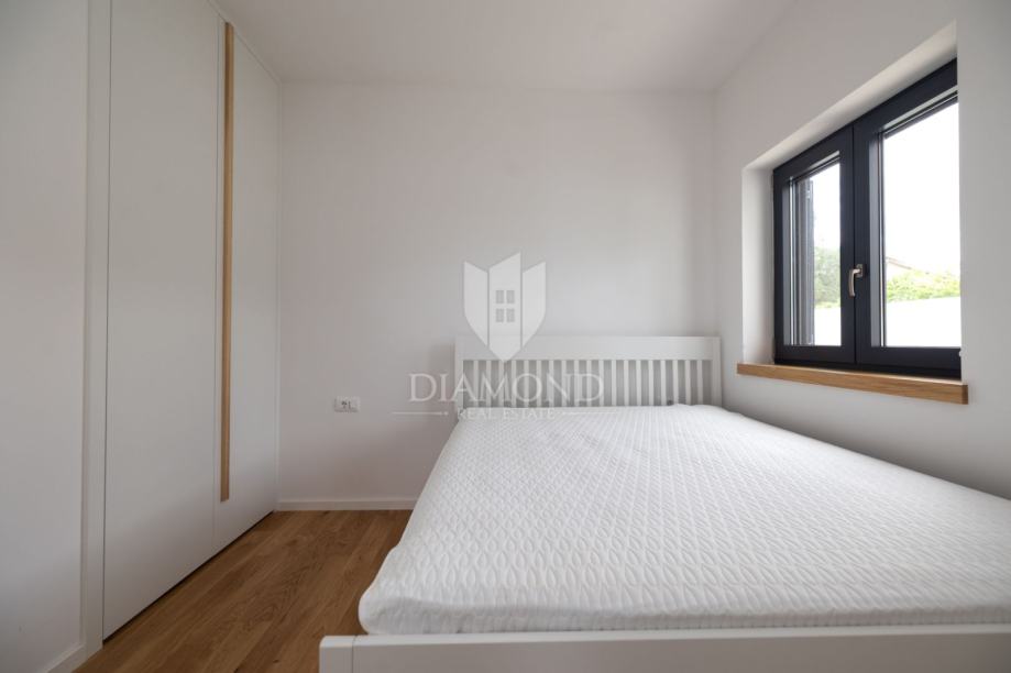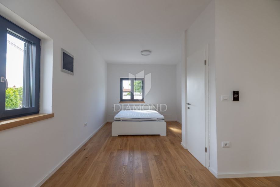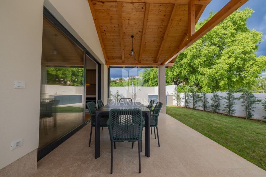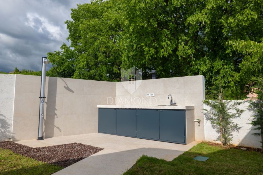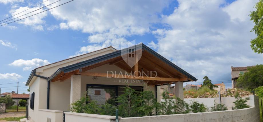 U centru mirnog mjesta nedaleko od Rovinja, smjestila se novoizgrađena prizemna kuća okružena zelenilom i ograđena zidom koji osigurava privatnost i osjećaj sigurnosti.