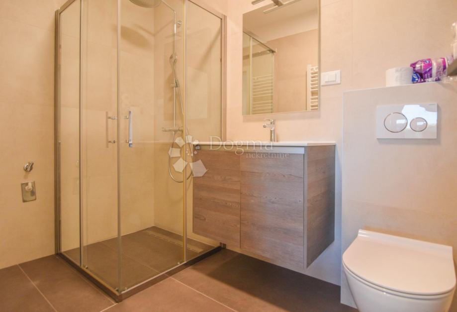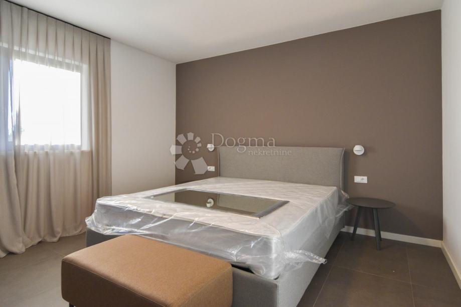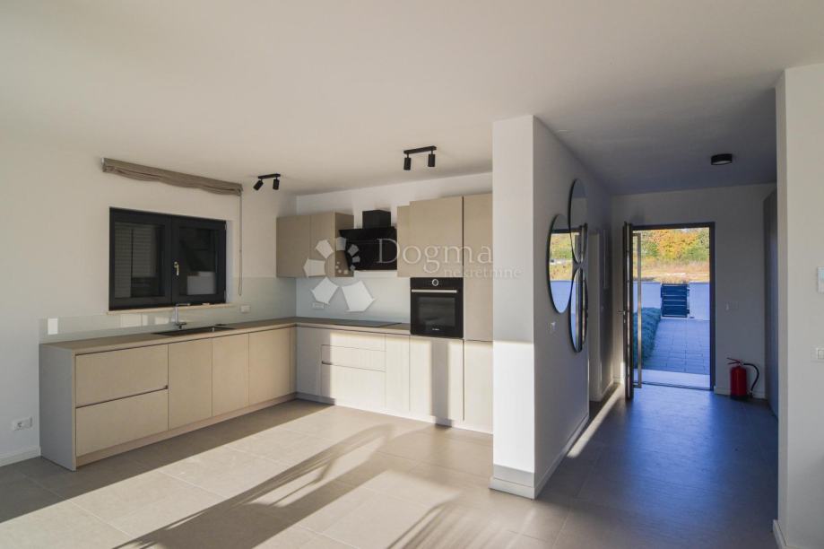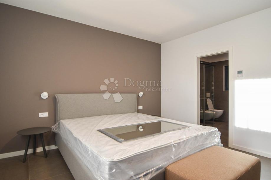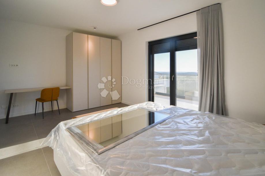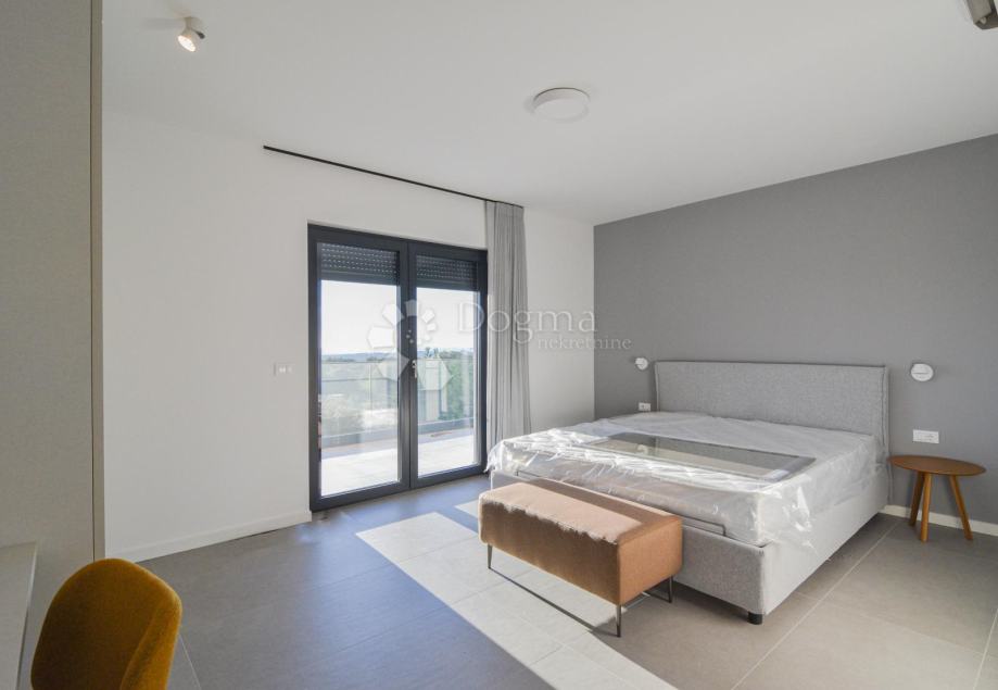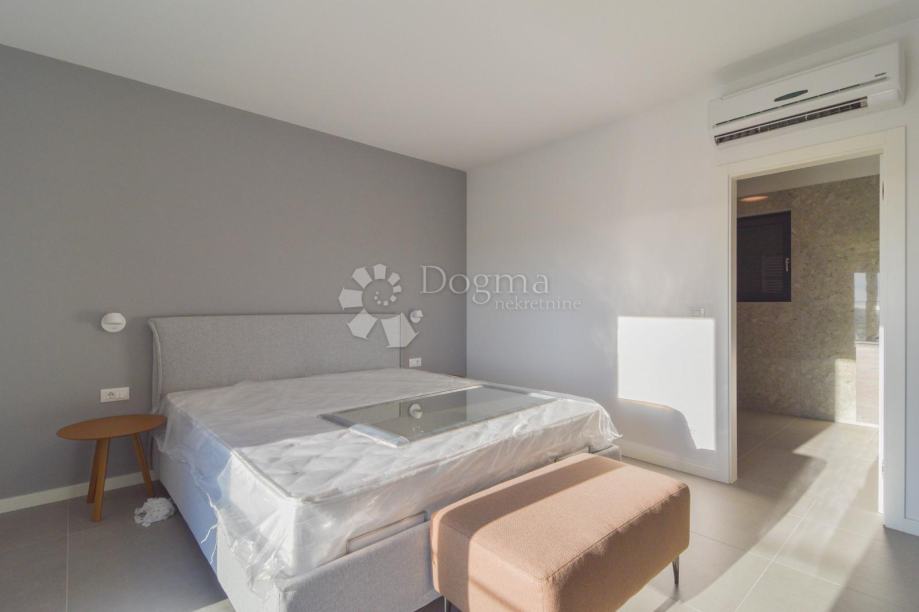 Na katu su smještene dvije prostrane spavaće sobe, svaka s privatnom kupaonicom, te velika terasa s koje se pruža spektakularan pogled na more i okolni istarski pejzaž.