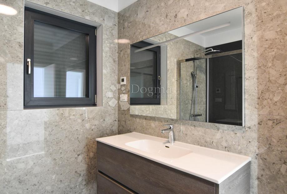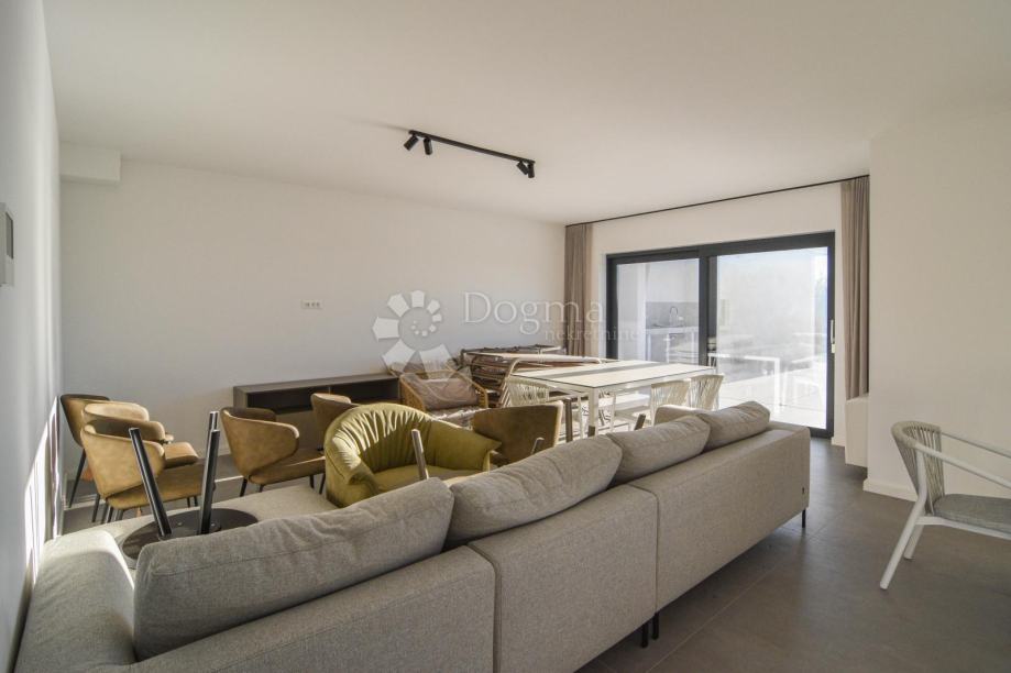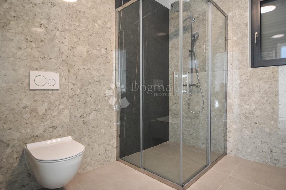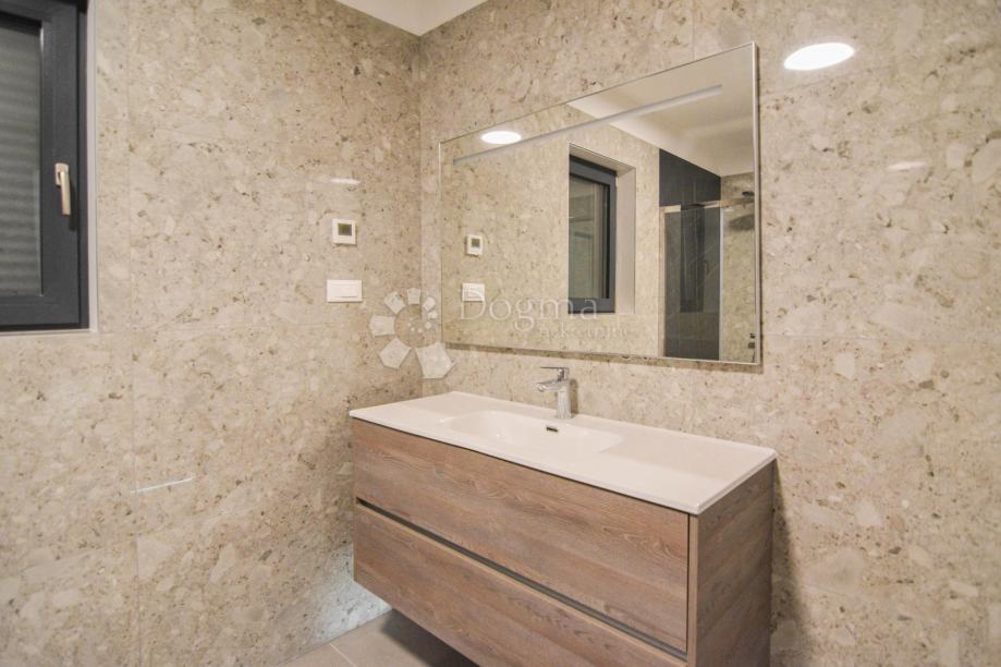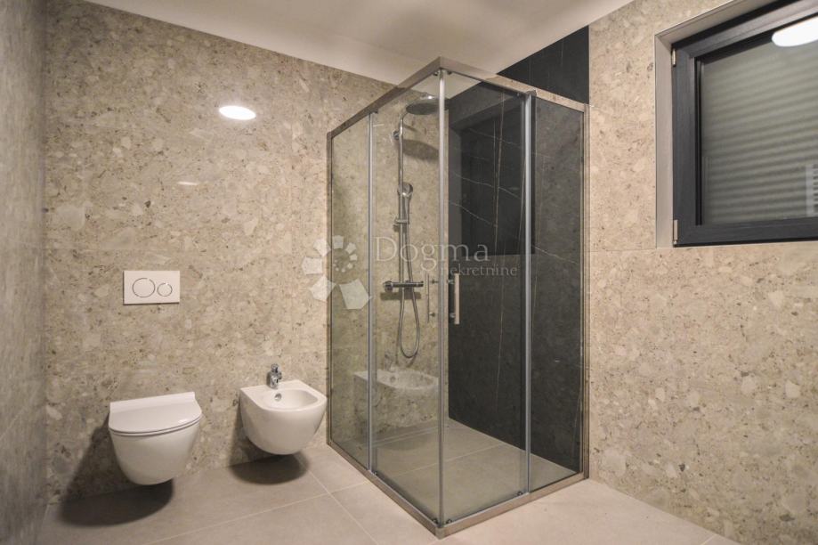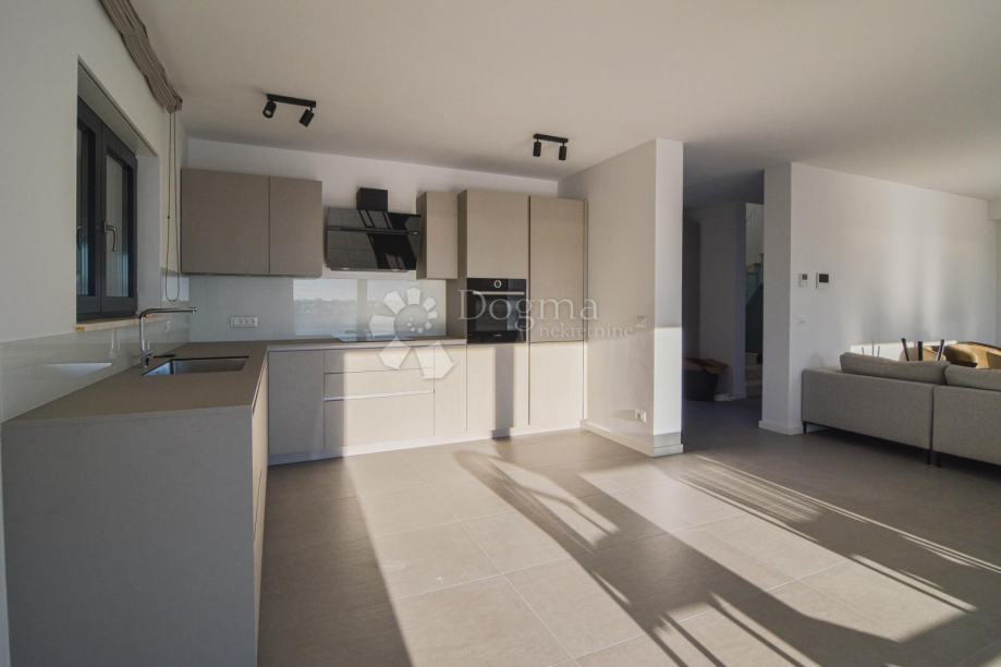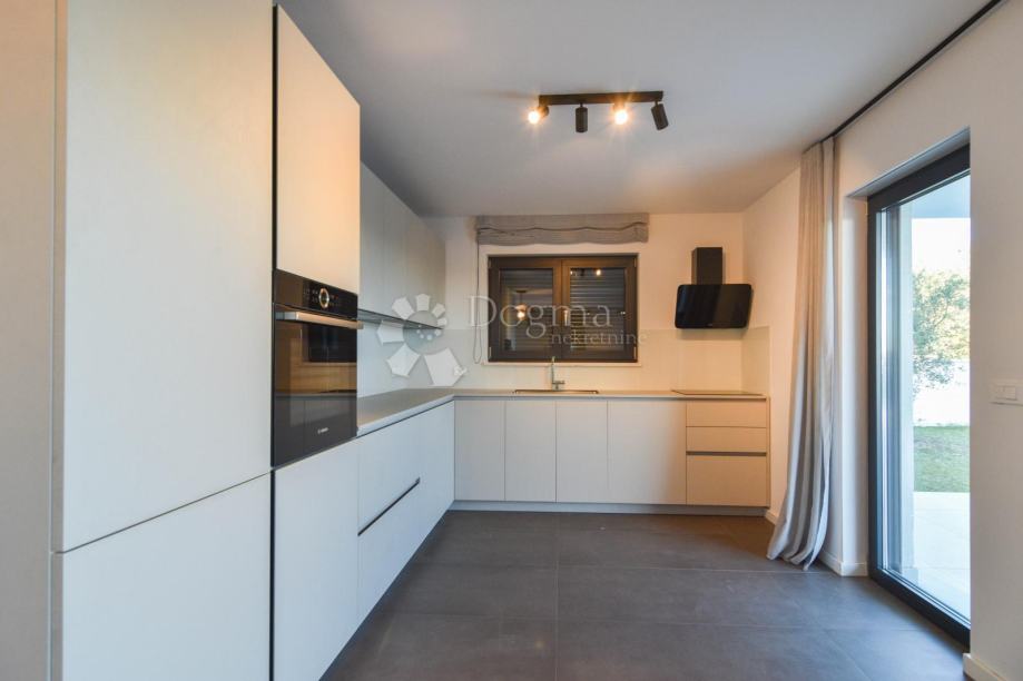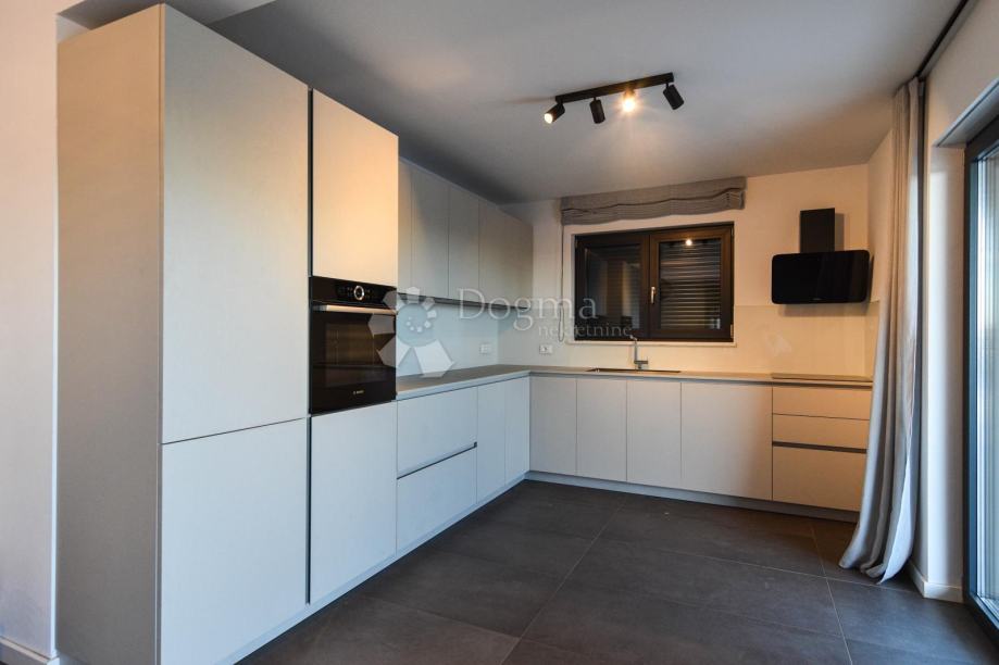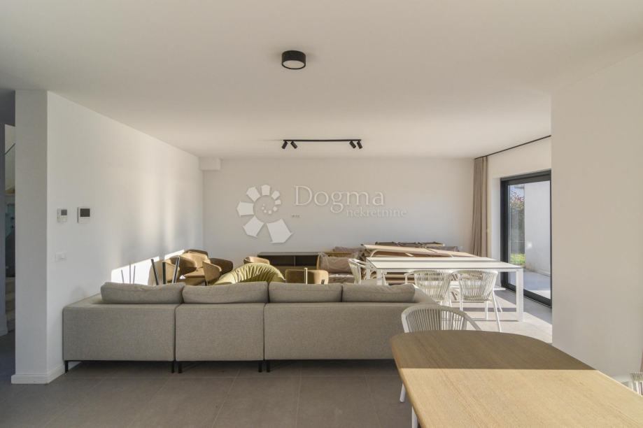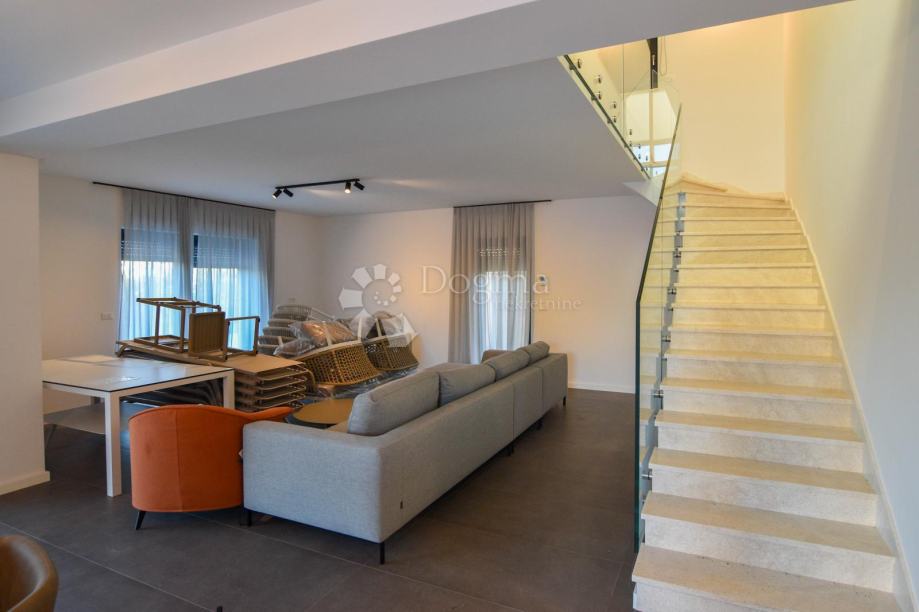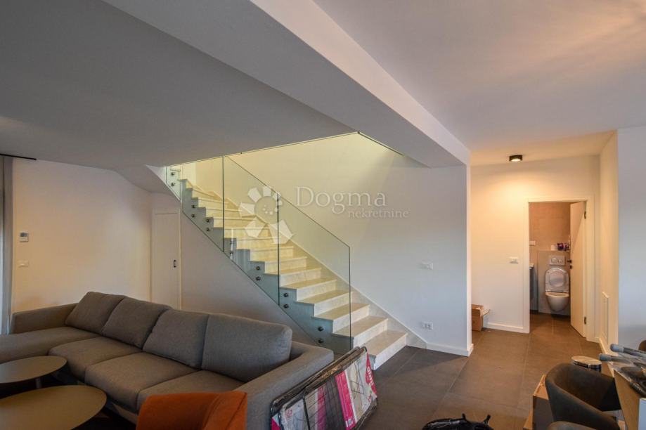 U prizemlju se nalazi prostrani open space koncept koji obuhvaća suvremeno opremljenu kuhinju, blagovaonicu i dnevni boravak s velikim staklenim stijenkama koje povezuju interijer s vanjskim prostorom. Iz dnevnog dijela izlazi se na pažljivo uređenu okućnicu s bazenom, sunčalištem i ljetnom kuhinjom – savršeno mjesto za opuštanje i druženje tijekom toplih ljetnih dana. Na istoj etaži nalazi se i spavaća soba s vlastitom kupaonicom te gostinjski WC.