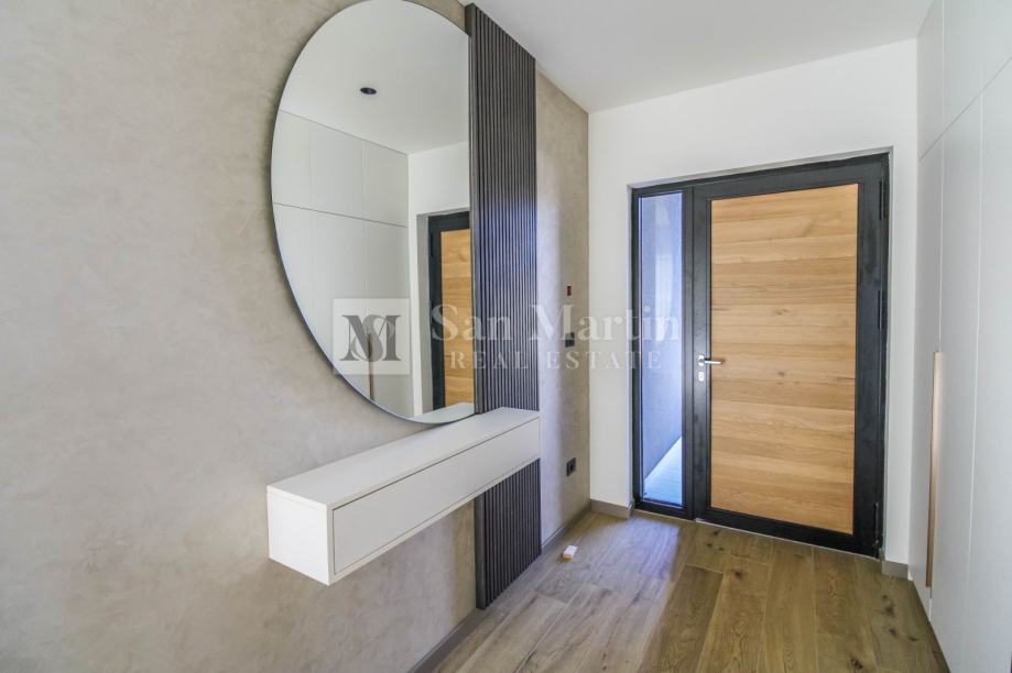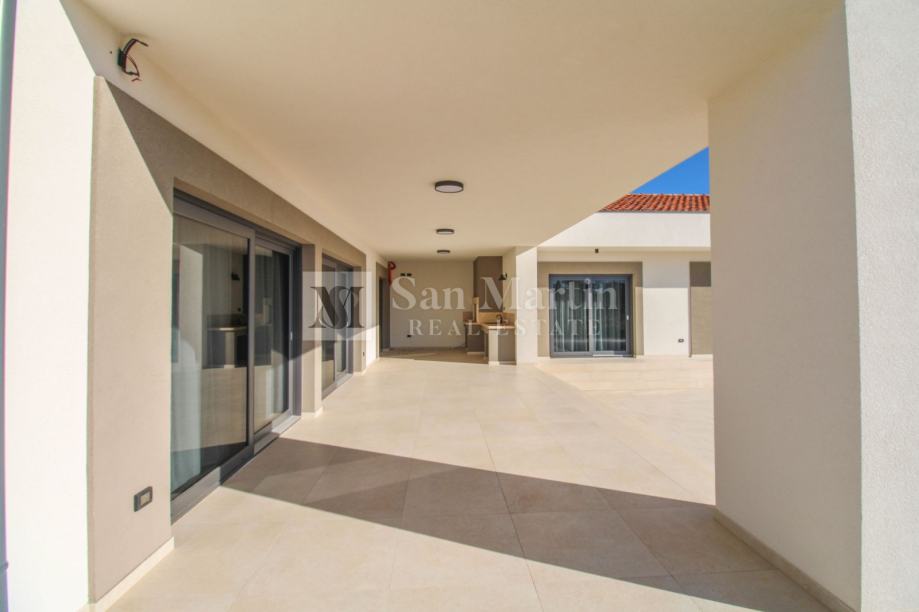 Ulaskom u kuću nailazimo na ulazno predsoblje koje s jedne strane vodi prema dnevnom dijelu koji se sastoji od kuhinje s blagovaonicom i ostavom te dnevnim boravkom u open space konceptu, dok je s druge strane hodnik sa tri velike spavaće sobe s vlastitim kupaonicama. Svaka prostorija u kući ima direktan izlaz prema bazenu, a iz dnevnog dijela se izlazi na prostranu natkrivenu terasu gdje je i vanjska kuhinja. U kući također nailazimo na vešeraj i gostinjski toalet.