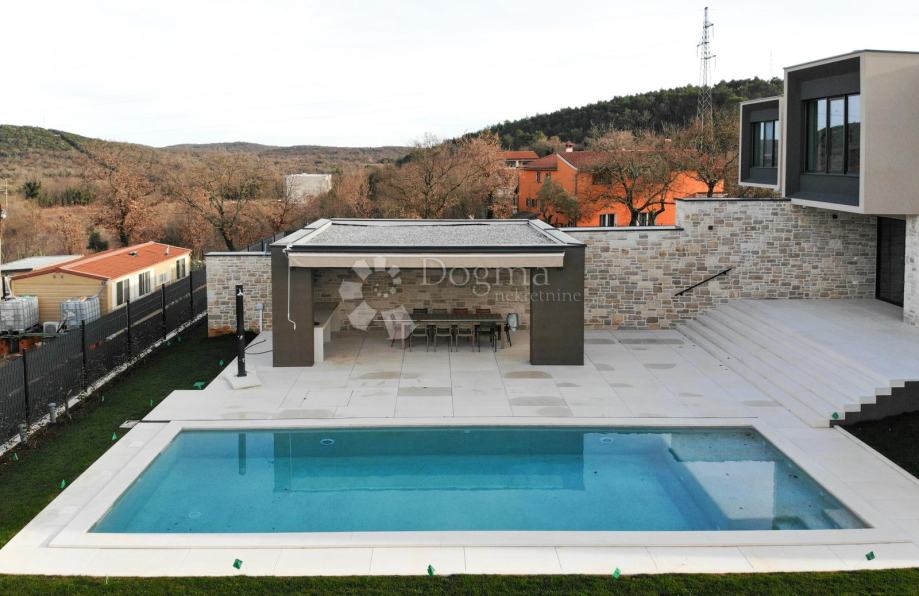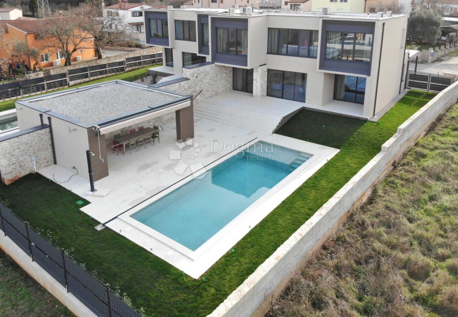 Ova luksuzna kuća površine 216 m2 smještena je u mirnom naselju u okolici Rovinja, s okućnicom od 550 m2, pružajući potpuni mir i privatnost. Svojom orijentacijom prema zelenilu i prirodi, kuća omogućava uživanje u mirnom okruženju, idealnom za obiteljski život.