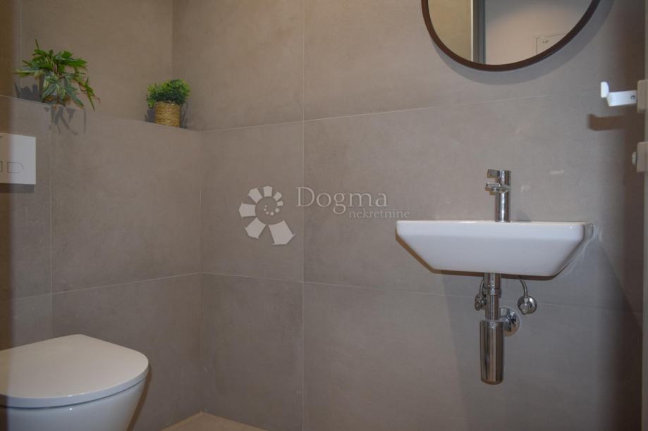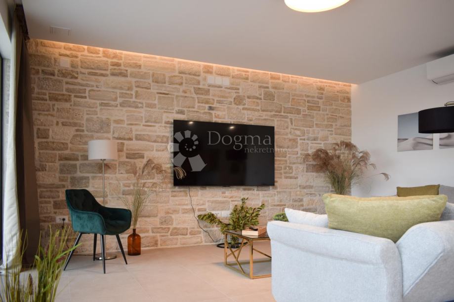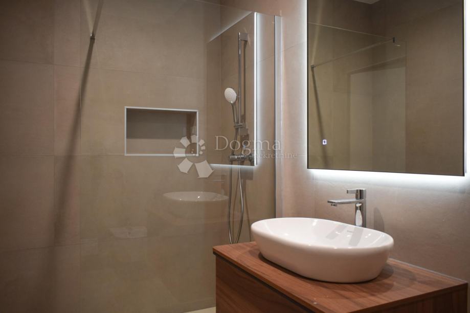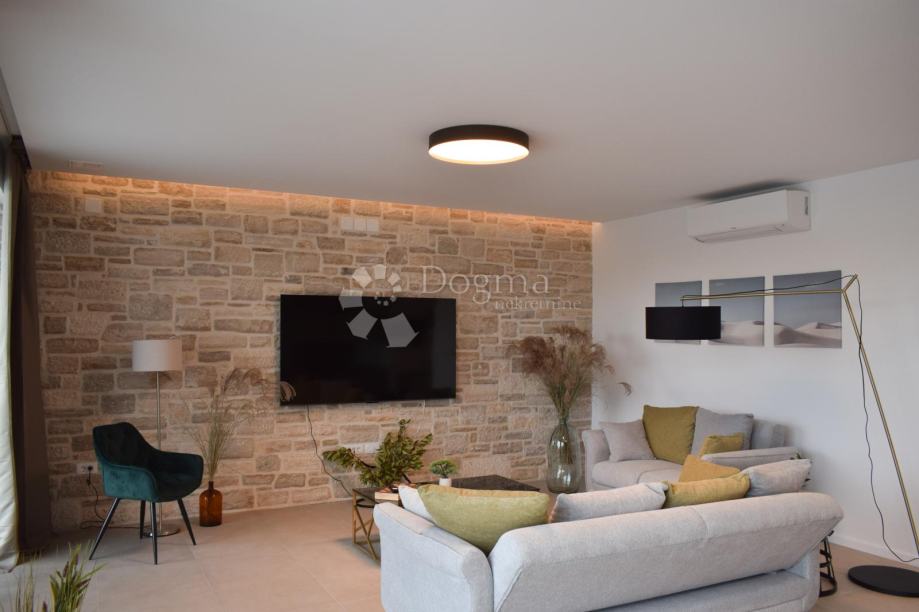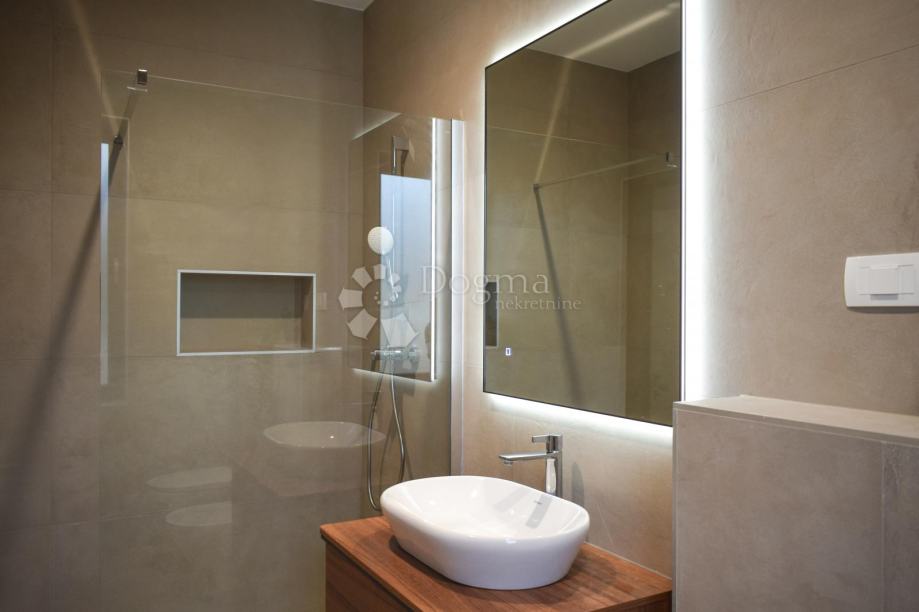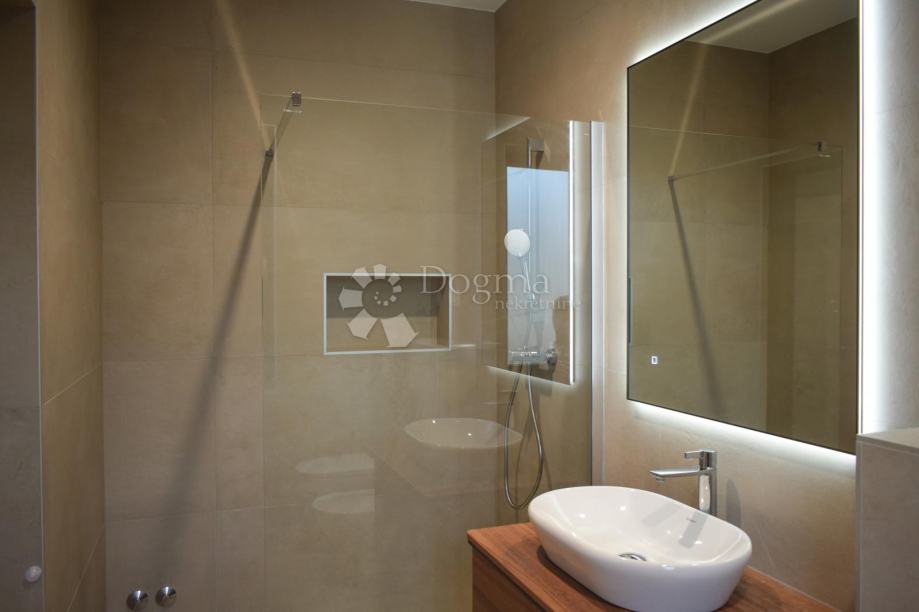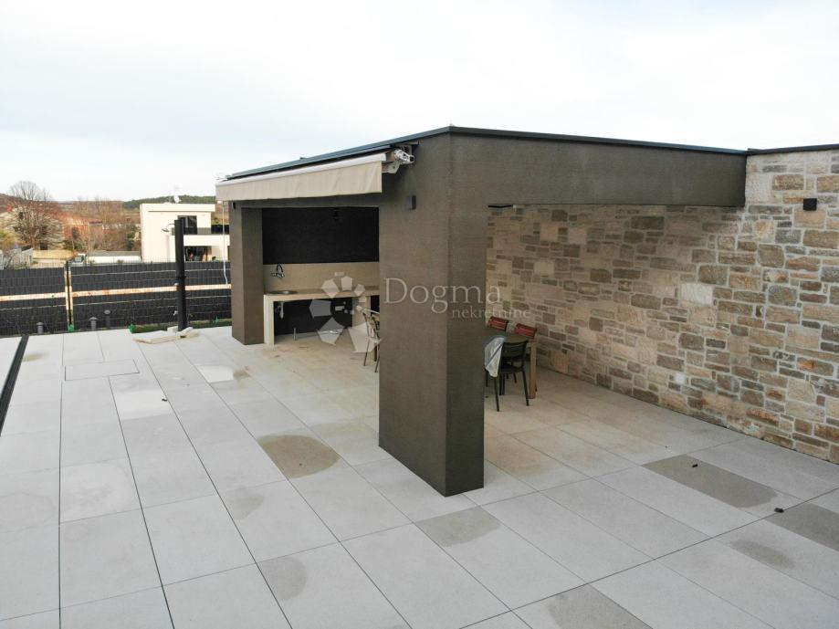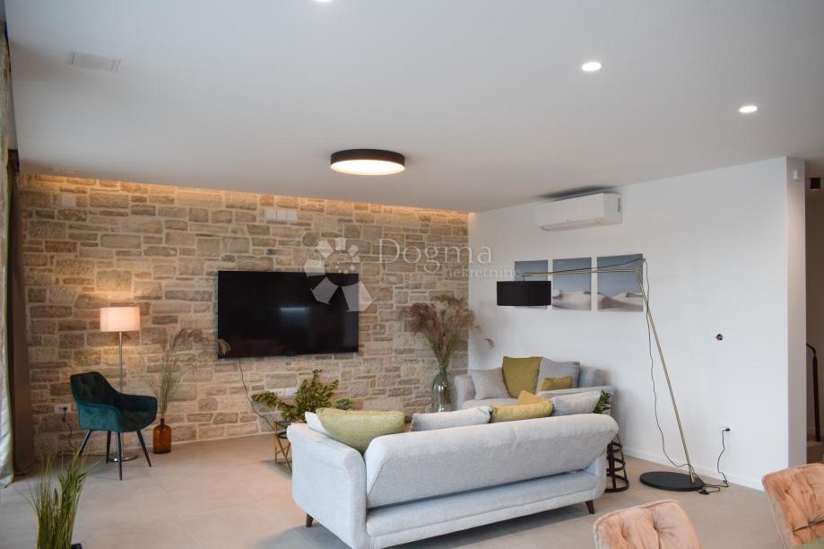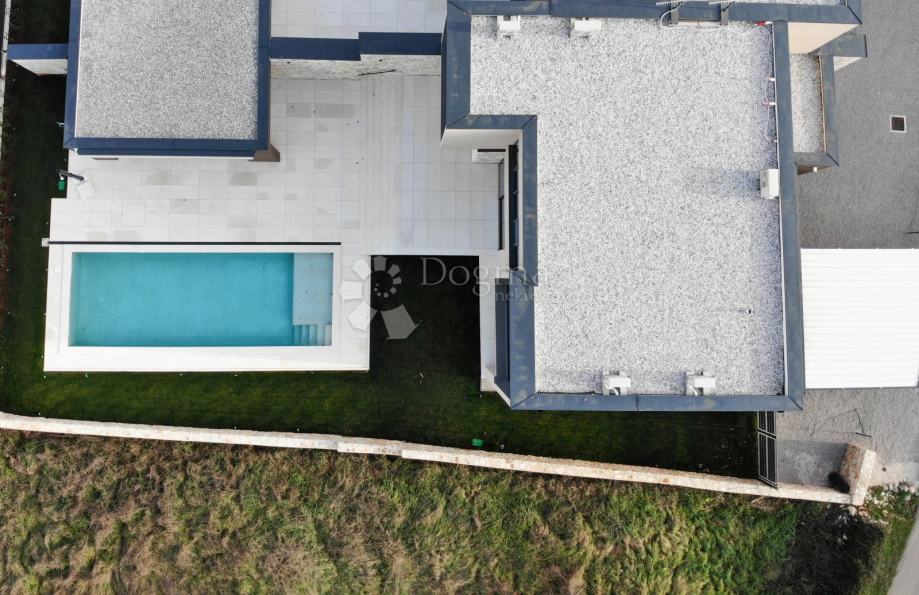 Vanjski prostor uključuje bazen površine 48 m2 na principu solne elektrolize, vanjski tuš, te ljetnu natkrivenu kuhinju od 26 m2, koja je idealna za obiteljska okupljanja i druženja. Uređeni travnjak s automatskim sustavom navodnjavanja dodatno doprinosi ljepoti okućnice.