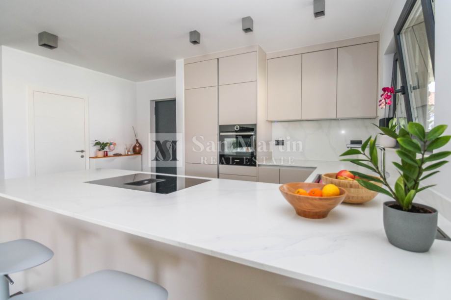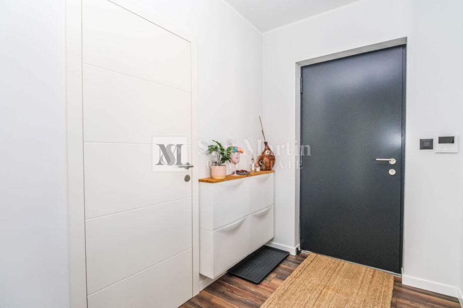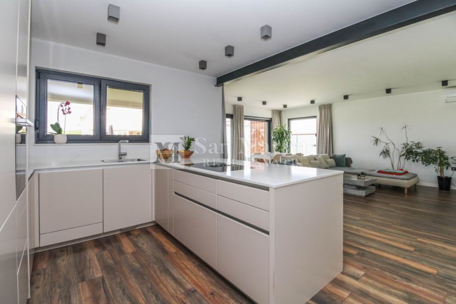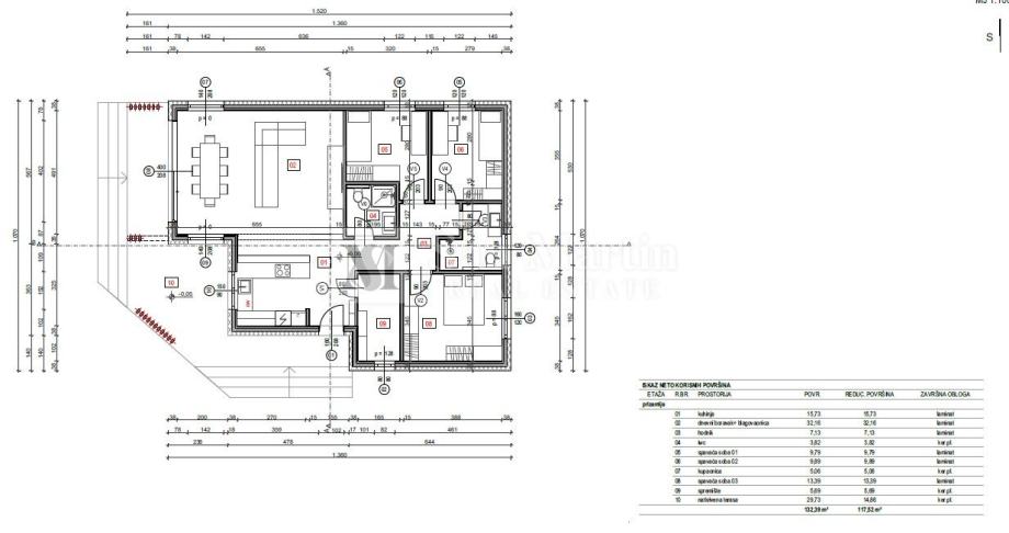 Kuća je smještena na zemljištu od 847 m2, te sama broji kvadraturu u naravi od otprilike 130m2. Tako su se tu smjestili veliki open space prostor sa kuhinjom i blagovaonicom koji se širi na vanjsku natkrivenu terasu te je uz velike staklene stijene vrlo osvijetljen tokom dana zahvaljujući jugozapadnoj orijentaciji. Također, tu je i hodnik koji vodi do tri spavaće sobe i dvije kupaonice. Kako bi bilo dovoljno prostora tu je i dodatna prostorija koja služi kao ostava.