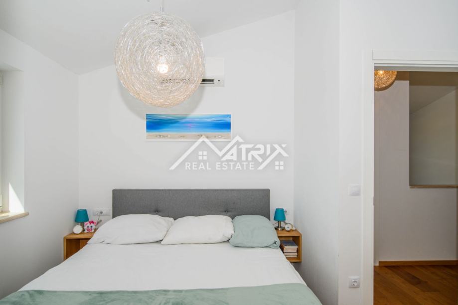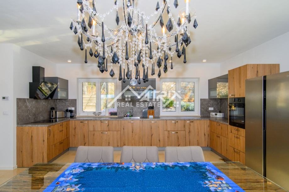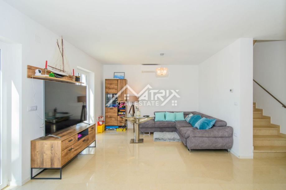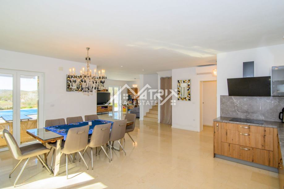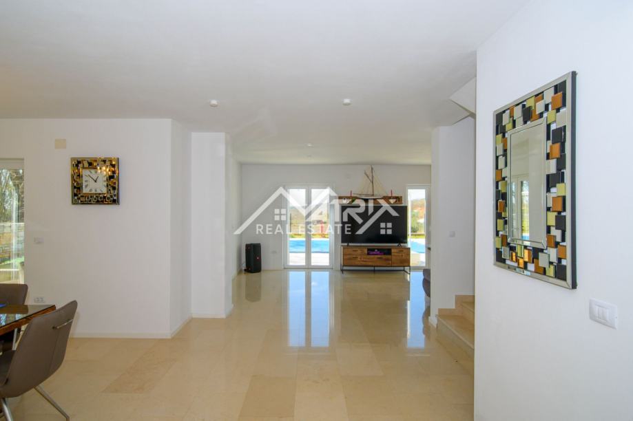 Kuća se prostire na dvije etaže: prizemlje i prvi kat. Centralni dio prizemlja je veliki prostor koji ujedinjuje dnevni boravak s blagovaonicom i kuhinjom, s izlazom na terasu bazena kroz velike staklene stijene, koje pružaju obilje dnevnog svjetla kroz cijeli dan. U prizemlju se također nalazi WC za goste. Na katu se nalaze tri kompletno opremljene spavaće sobe od kojih master spavaća soba ima vlastiti walk-in ormar, te jedna kupaonica s kadom i walk-in tušem. Dvije spavaće sobe imaju izlaz na terasu sa koje se pruža prekrasan otvoreni pogled na prirodu.