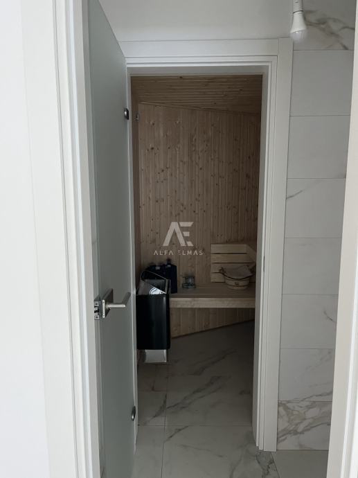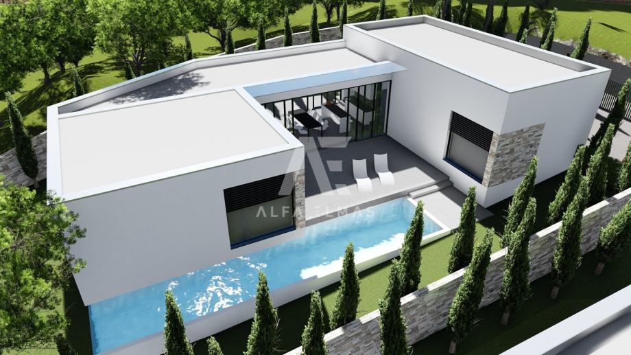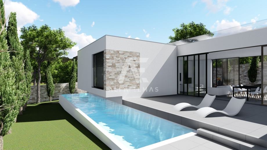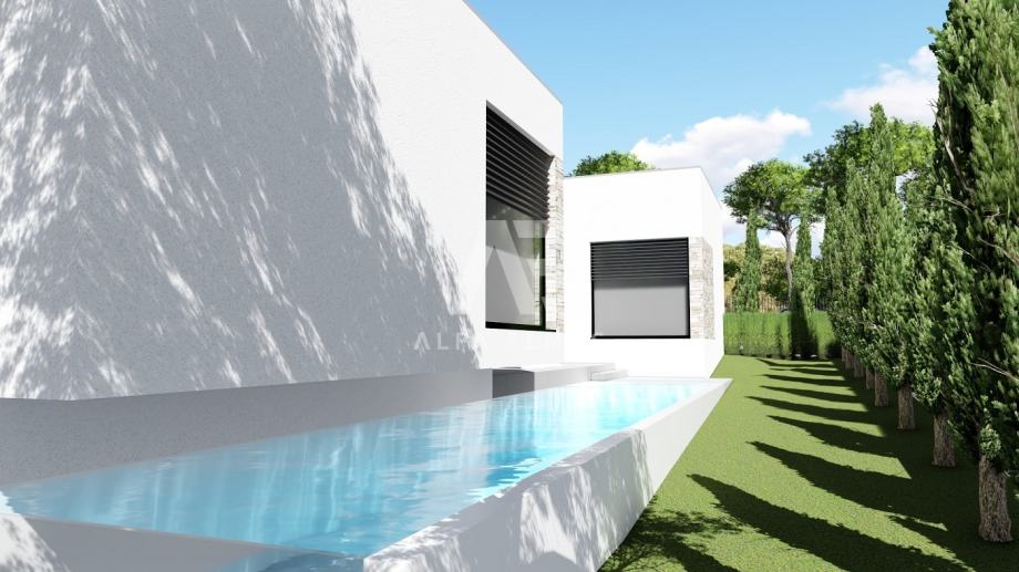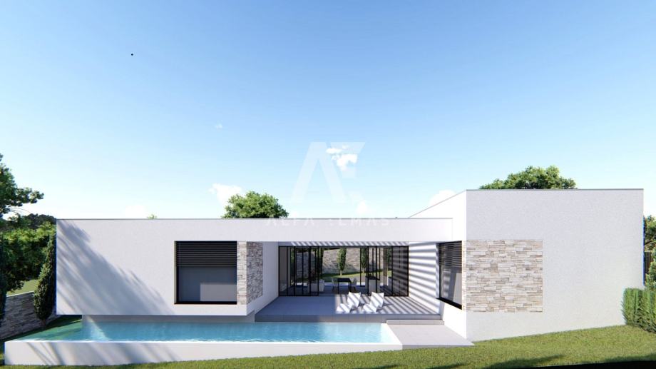 Rovinj, okolica, novogradnja, luksuzna vila sa bazenom na mirnoj lokaciji. Sama Vila zauzima stambenu površinu od 218m2 na parceli od 551m2. Svojim dizajnom nastoji objediniti unutarnji i vanjski prostor u suvremenoj, profinjenoj maniri. Jednoetažna gradnja inspirirana prostornim fluiditetom olakšava organizaciju i kretanje. U suterenu luksuzne Vile predviđen je prostran prostor namijenjen za saunu sa kupaonicom, kotlovnicom i spremištem. Unutarnje stepenište vode na kat koji se sastoji od ulaznog hodnika, wc-a, prostranog i prozračnog dnevnog boravka, kuhinje, blagovaonice, četiri spavače sobe svaka sa vlastitom kupaonom i terasom.