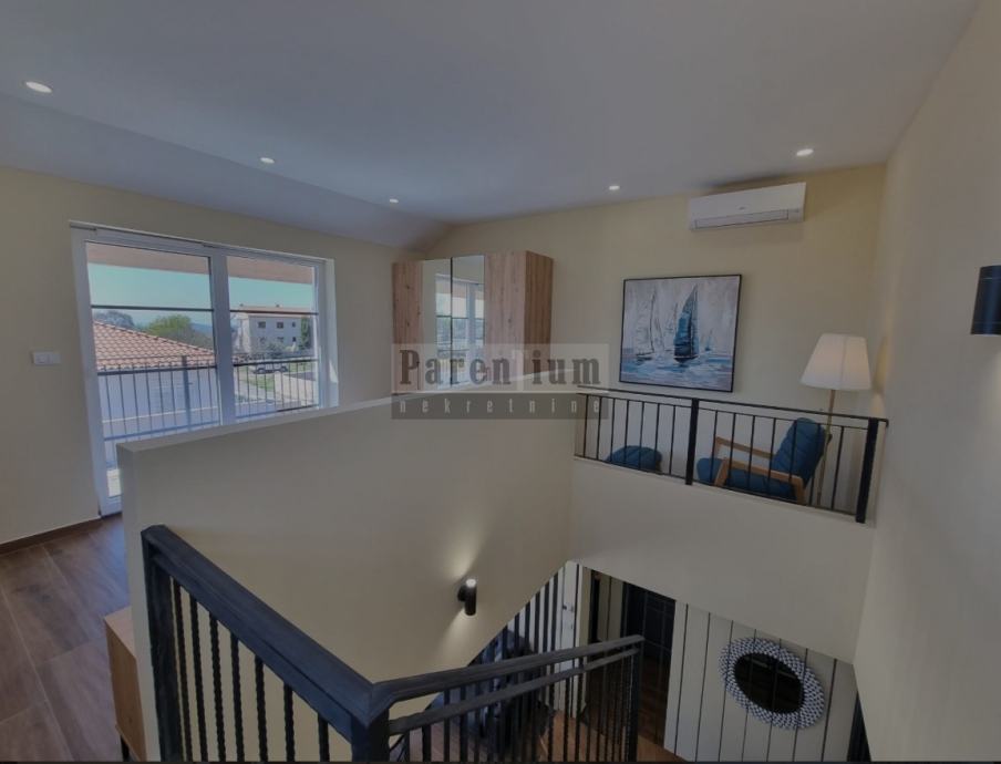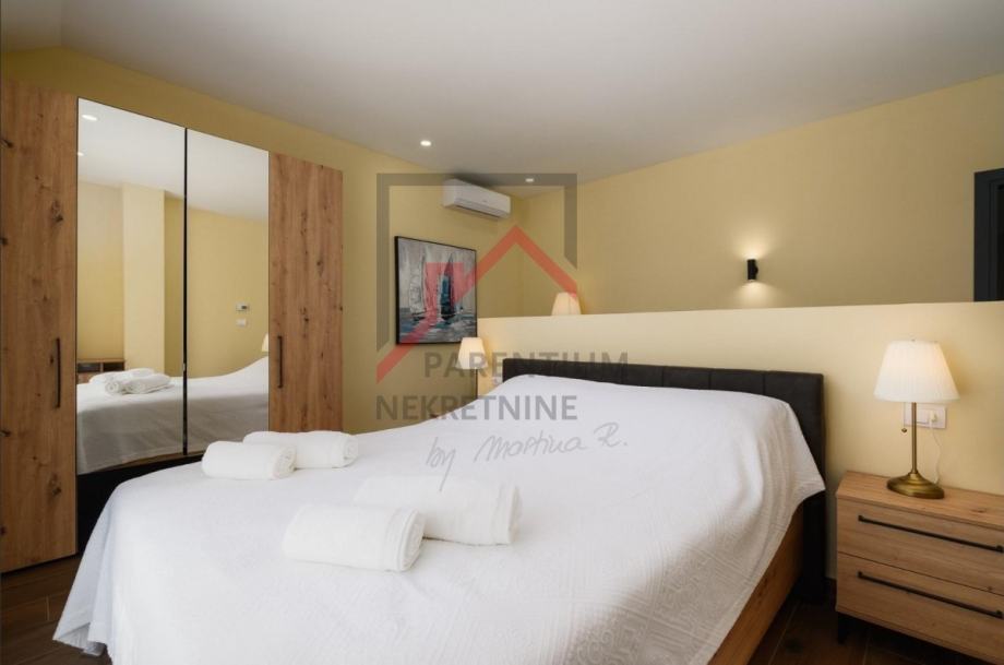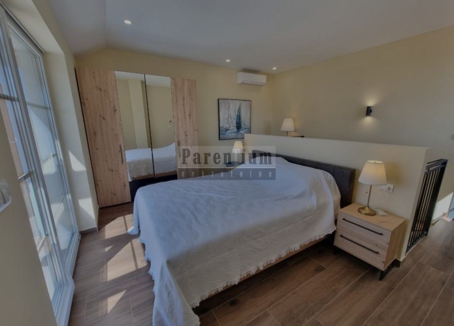 Masivno drveno stubište gazišta od hrasta vodi nas na kat kuće gdje se nalazi još jedna spavaća soba s pogledom na okolicu i more. Soba također ima vlastitu terasu i veliku luksuznu kupaonicu.