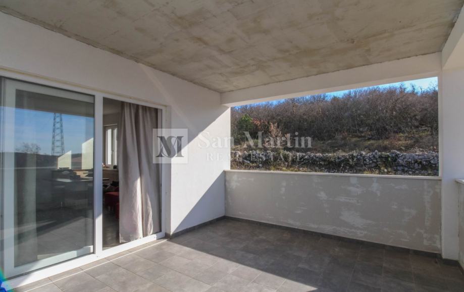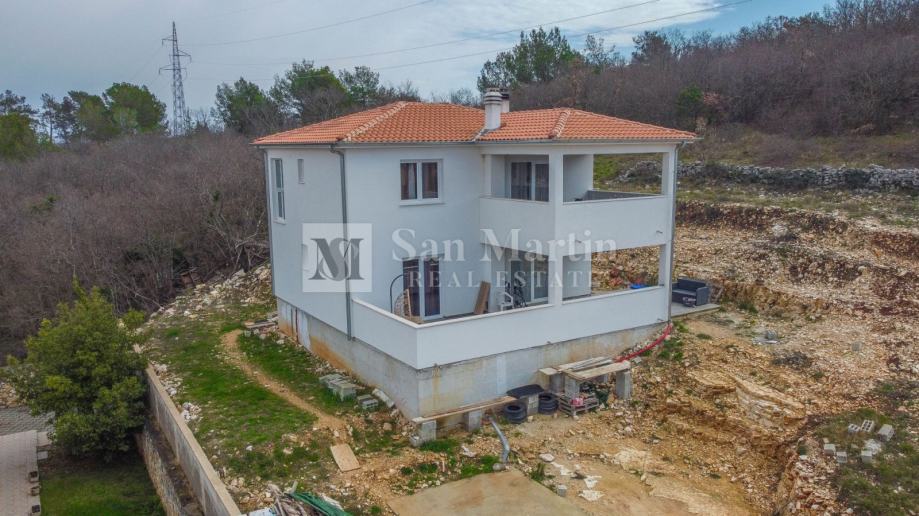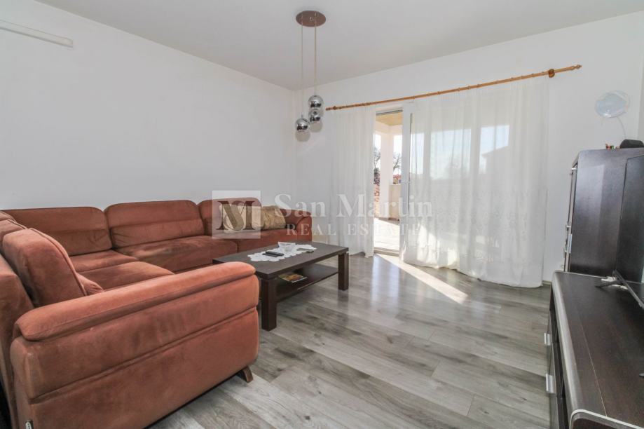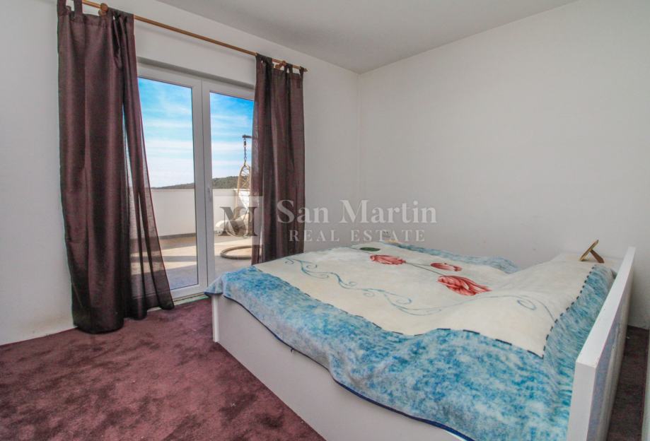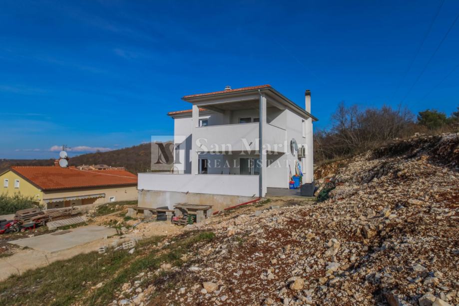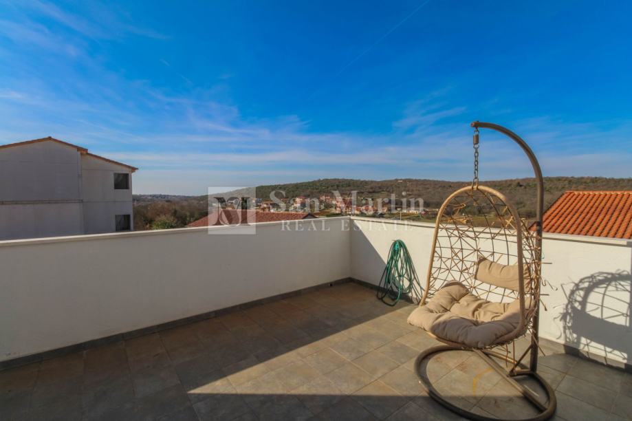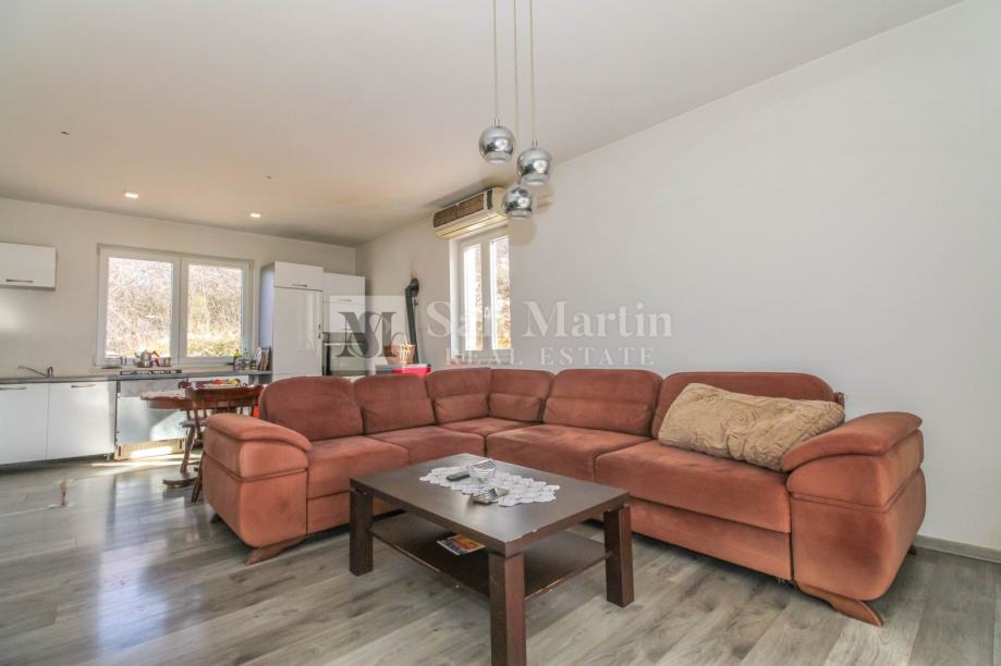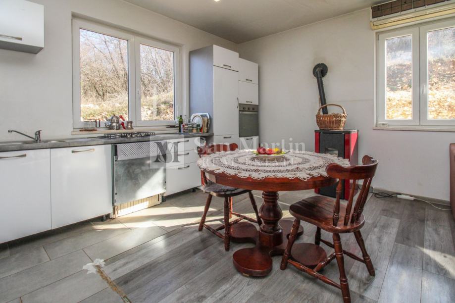Dnevni boravak te spavaća soba u prizemlju imaju izlaz na veliku terasu sa koje se prostire pogled na okolicu a jednim dijelom i na more u daljini. Za grijanje tu je peć na pelete, a kuća ima i klima uređaj.