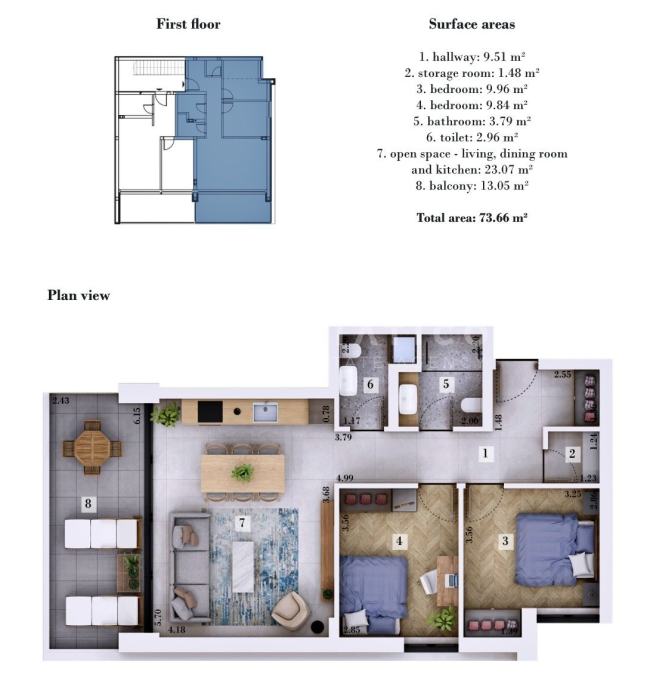 Stan na prvom katu zgrade površine je 73,66 m2 i sastoji se od open space dnevnog boravka s blagovaonicom i kuhinjom, kupaonice, toaleta, dvije spavaće sobe, spremišta i terase.