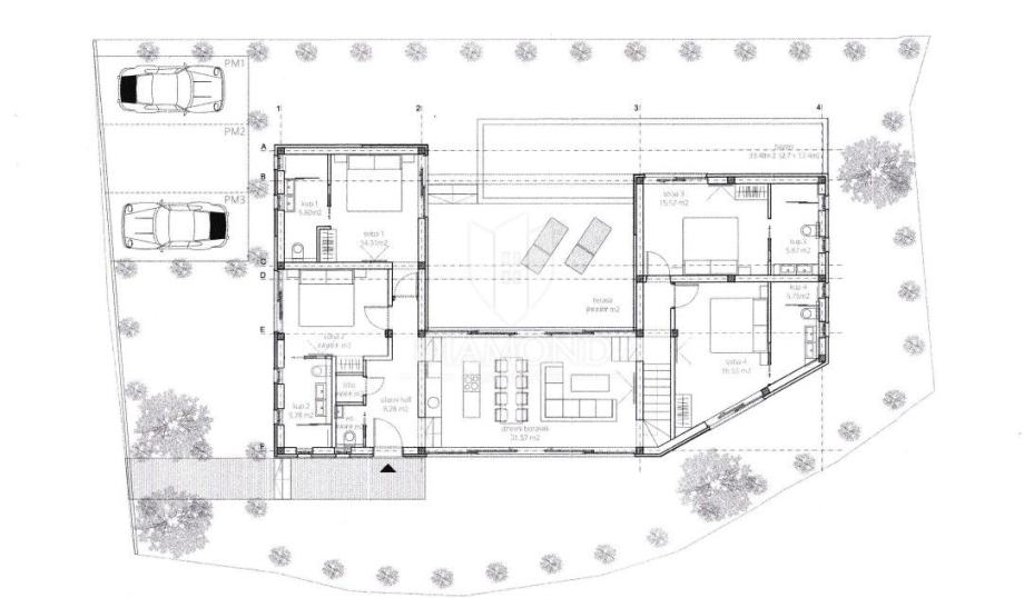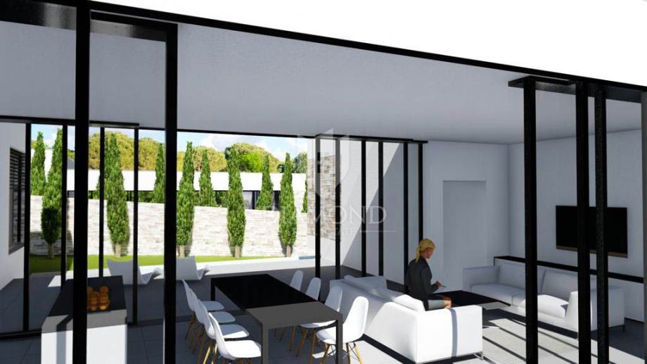 Okućnica kuće će biti hortikulturno uređena u mediteranskom stilu, te ista uključuje tri parkirna mjesta za Vaše limene ljubimce. Uz kuću se nalazi bazen, sunčalište te lounge zona terase koja se spaja sa dnevnim dijelom kuće.