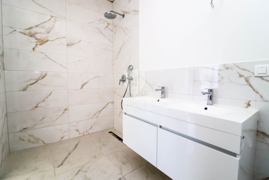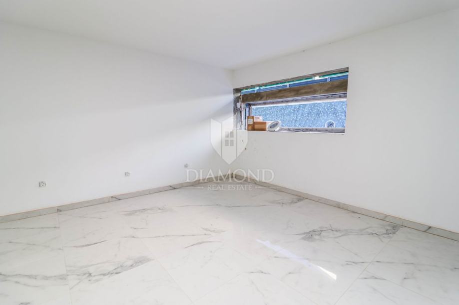 U prizemlju se nalazi ulazno predsoblje, prostrani dnevni dio sa kuhinjom i blagovaonicom, četiri spavaće sobe sa vlastitim kupaonicama, ostava te sanitarni čvor. Najveći adut prizemlja su velike staklene stijene u dnevnom dijelu gdje se otvaranjem istih postiže jedan odličan spoj s okućnicom. U dnevnom dijelu se nalazi i stepenište prema suterenu gdje je wellness sa jacuzzijem i predviđena fitness zona sa finskom saunom te wc-om i tušem. Tu se smjestila i kotlovnica za olakšan pristup. Grijanje je podno, te je sprovedeno kroz cijelu kuću, dok su kao dodatak u svakoj prostoriji visokokvalitetni klima uređaji.
