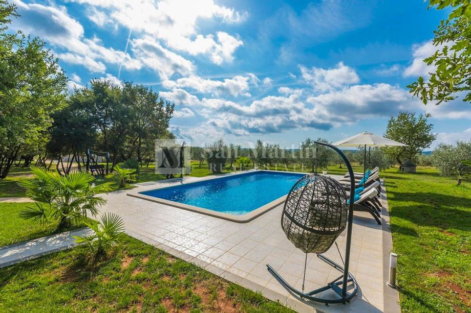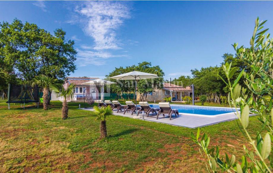 Okućnica je vrlo velika, no ista je uredno održavana i ograđena. Posebnu pažnju privlači bazen koji je sa vlastitim sunčalištem odlično povezan s kućama putem staza.