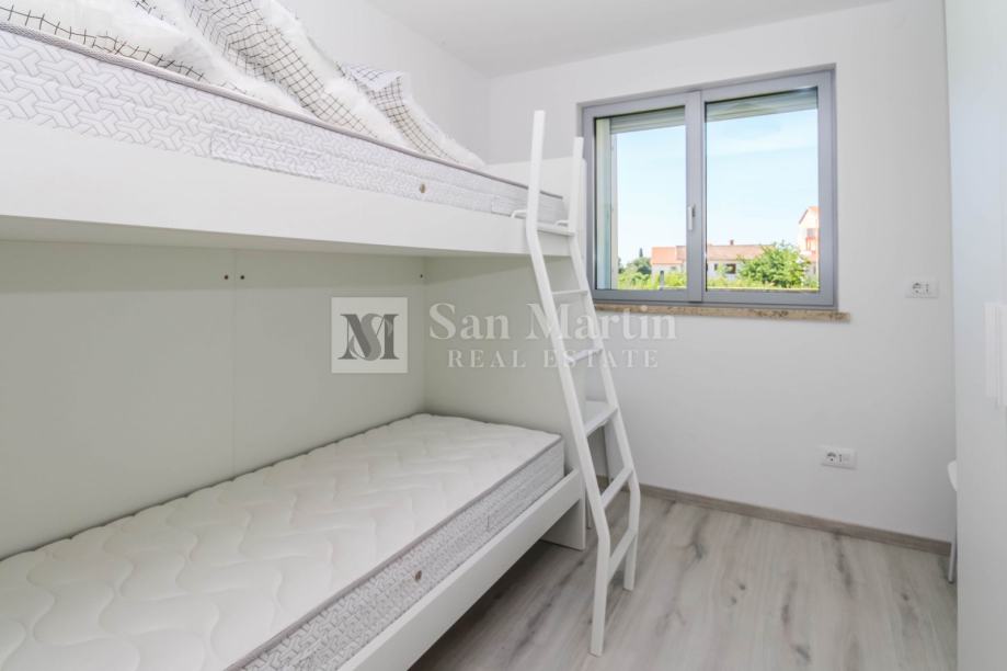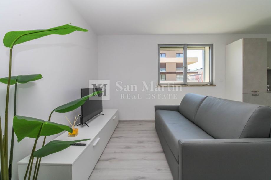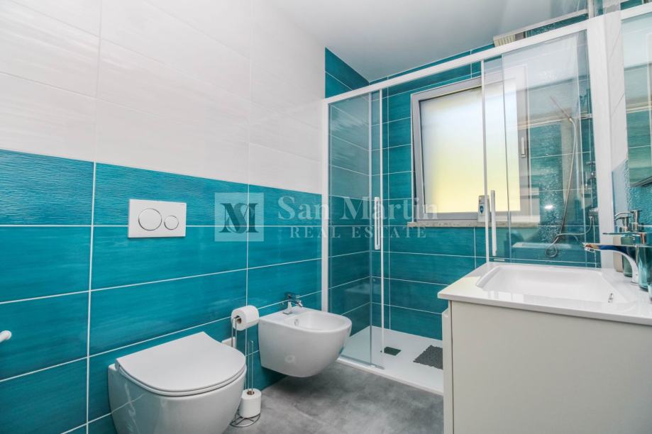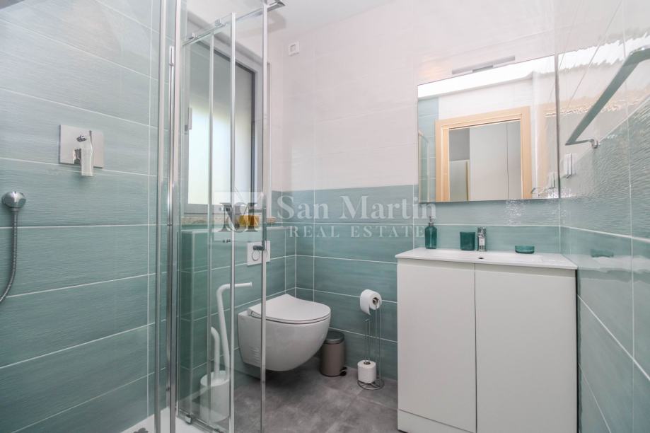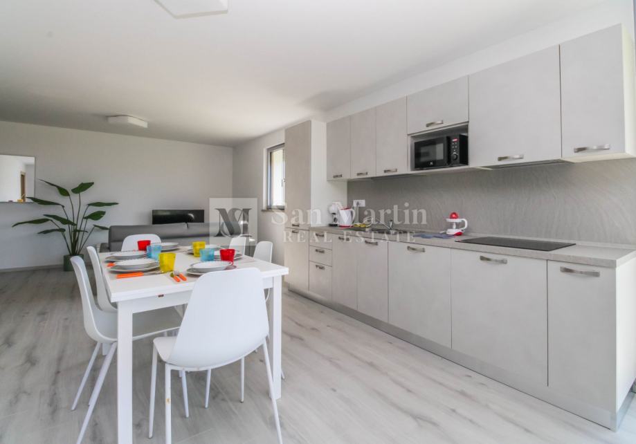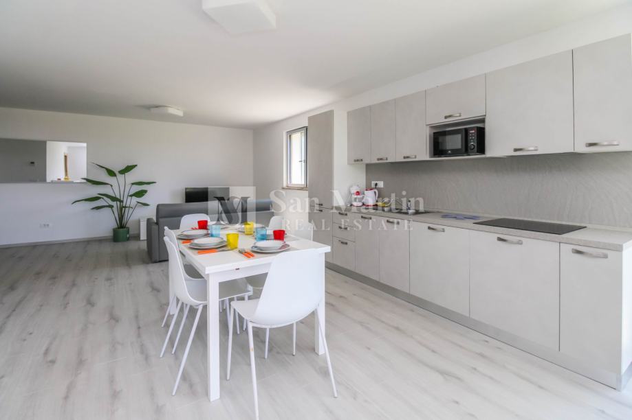 Stan je potpuno namješten i opremljen, uključujući Daikin fan coil sustav za grijanje i hlađenje s termostatima i skrivenim ventilacijama u svakoj prostoriji, protuprovalna vrata, videoparlafon, električne rolete te ventilirajuće podne obloge na terasi.