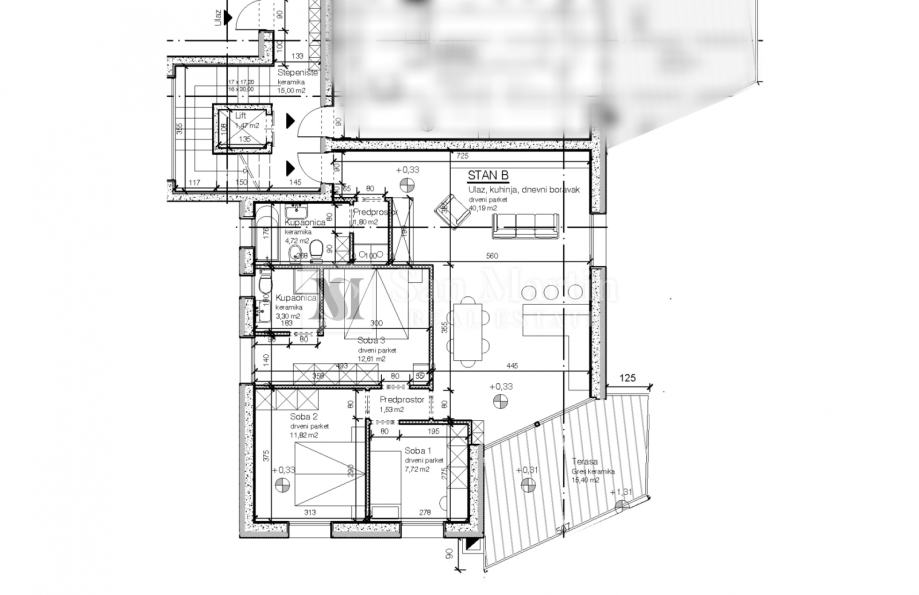 Stan se nalazi u prizemlju te uključuje garažno parkirno mjesto i vlastitu okućnicu. Stambena površina iznosi 96 m², a prostor je pažljivo osmišljen kako bi pružio maksimalnu udobnost. Tako da su tu open-space dnevni boravak s kuhinjom i blagovaonicom, tri spavaće sobe te dvije kupaonice. Dnevni prostor povezuje se s terasom od 15m2 kroz velike klizne stijene koje omogućuju obilje prirodnog svjetla i neometan prijelaz između unutarnjeg i vanjskog prostora.