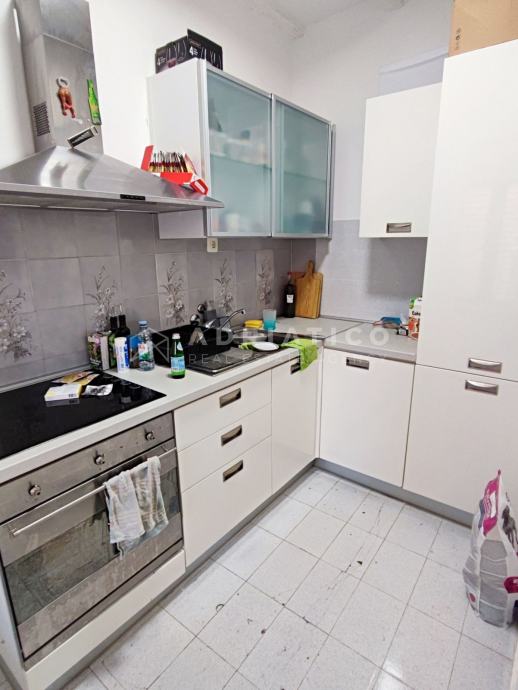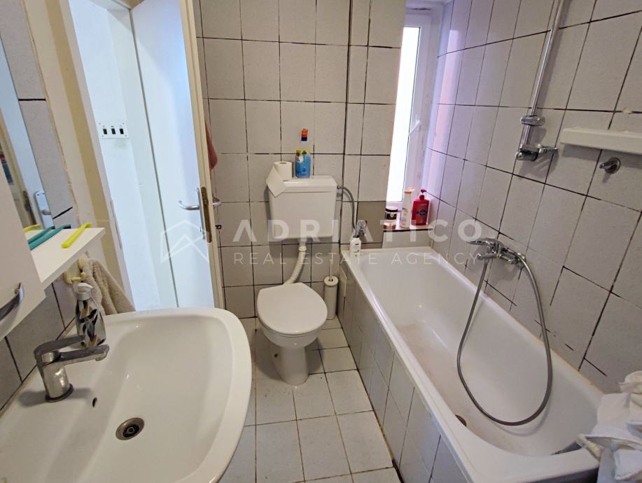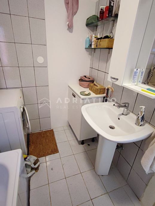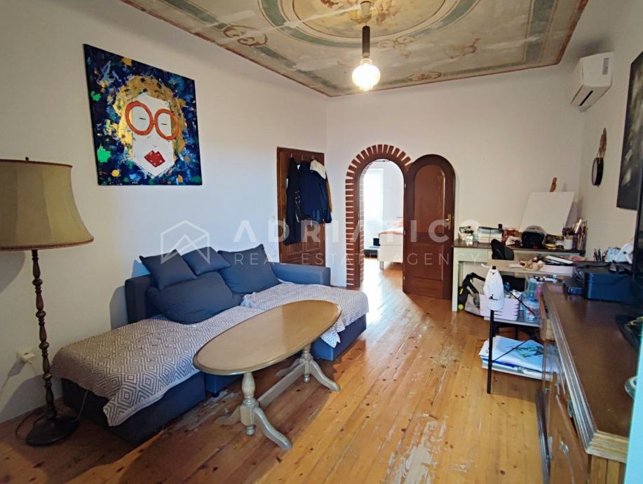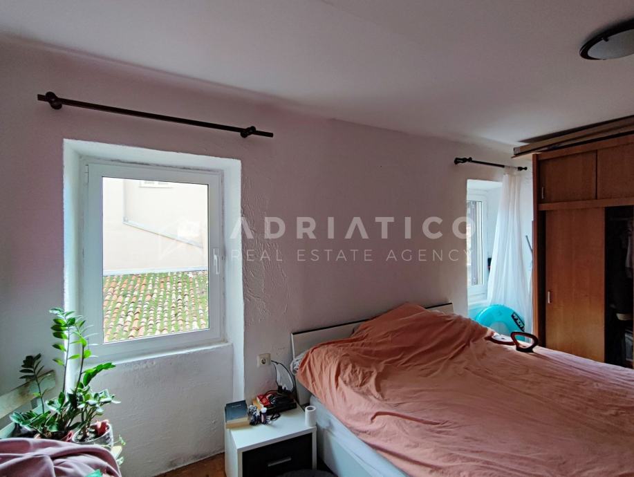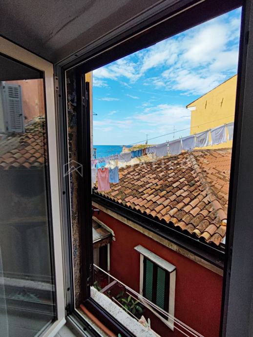 U zavučenoj ulici na drugom katu starije zgrade nalazi se ovaj stan površine 43m2 s pogledom na more te je zbog svoje orijentacije vrlo osunčan i prozračan.