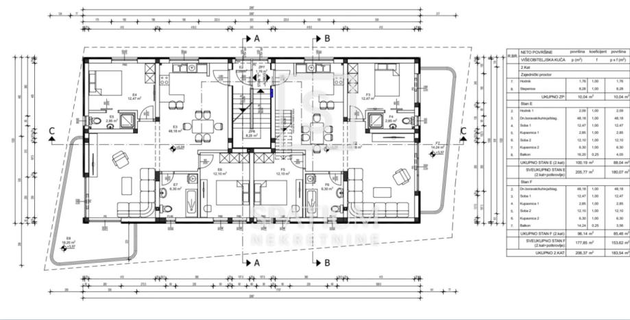 Stan (F) se nalazi na drugom katu i prostire se na dvije etaže. Sadrži tri spavaće sobe, dvije kuhinje, blagovaonicu, dnevni boravak, tri kupaonice, balkon, prostor za druženje te nenatkrivenu terasu. Velike staklene stijene, podno grijanje na struju i mogućnost ugradnje dizala čine ovaj stan modernim i funkcionalnim.