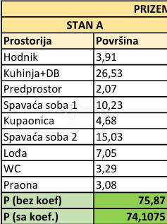 Stan “A”, smješten u prizemlju, ukupne netto površine sa koeficijentima 74 m² sa izvrsno osmišljenim rasporedom: