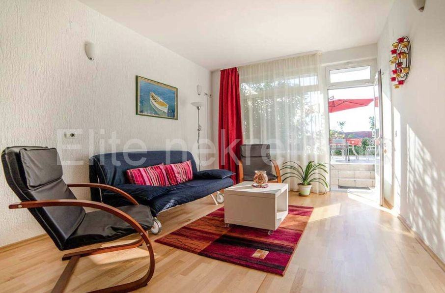 Ispred stana je terasa na koju se izlazi i sa glavnog ulaza i iz dnevnog boravka.