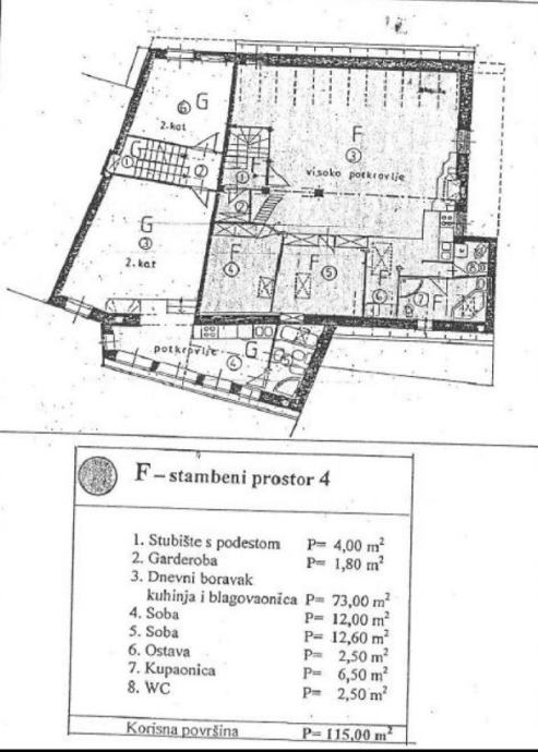 Ovaj prostrani stan smješten na drugom, odnosno zadnjem katu stoljetne zgrade površine je 115m2, a sastoji se od: