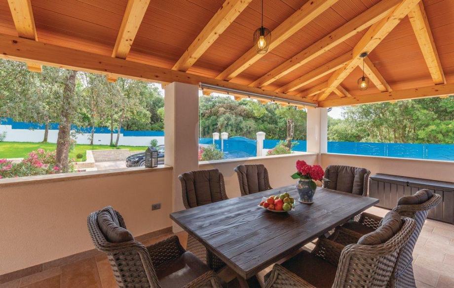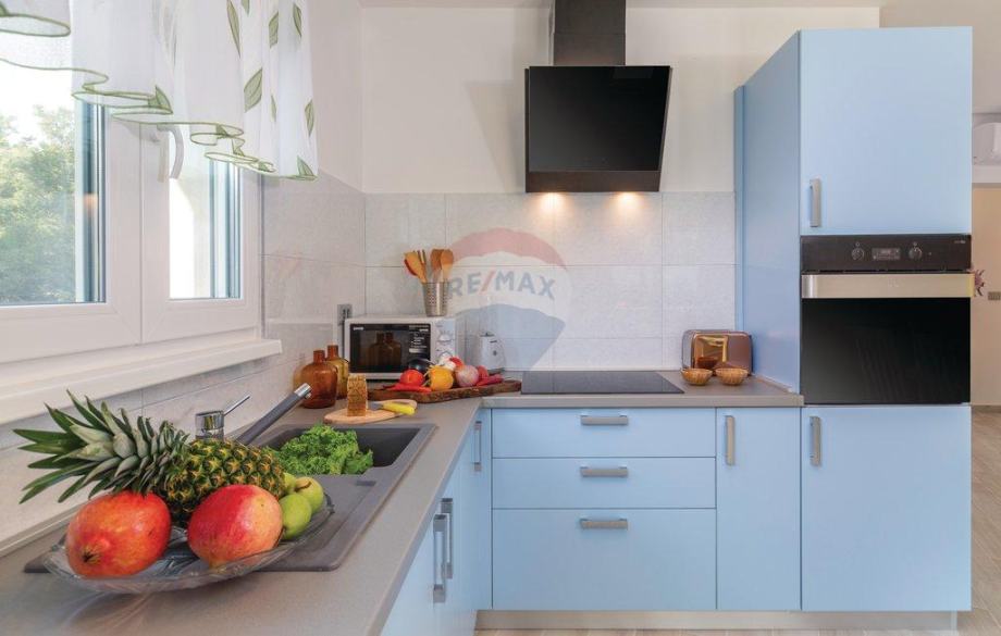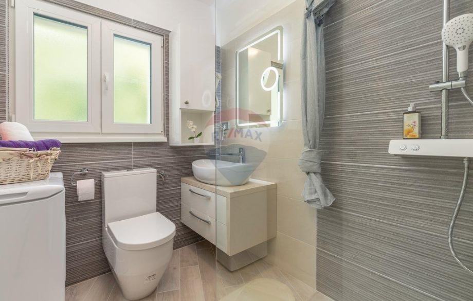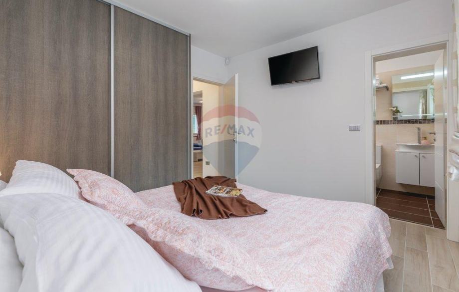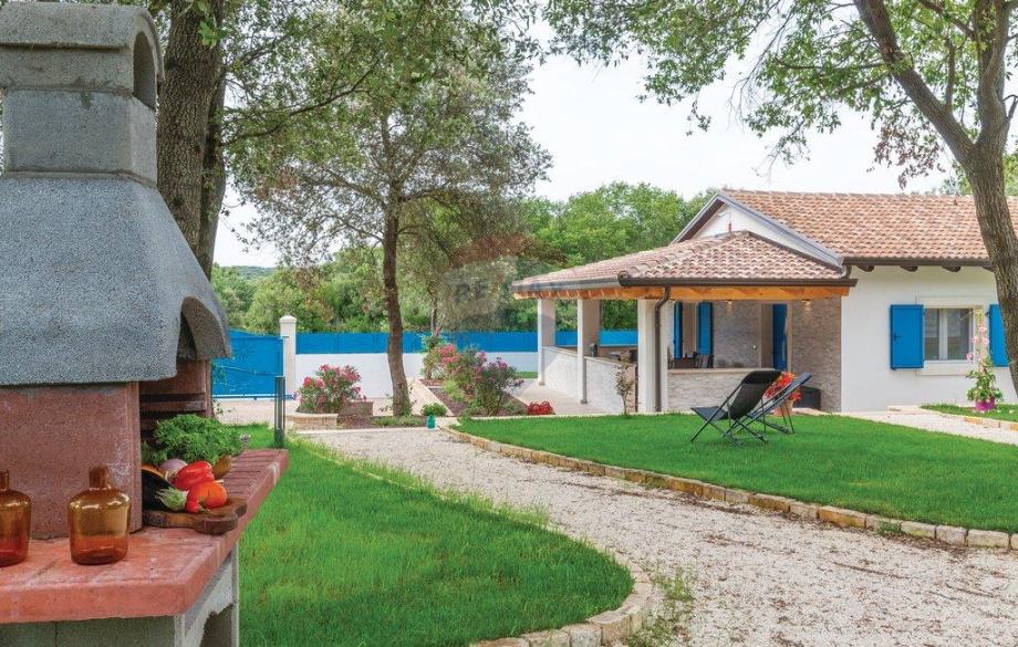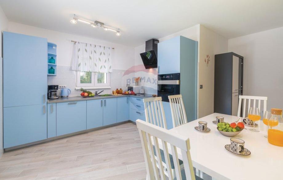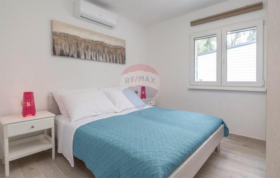 svaka sa vlastitom kupaonicom. Plinsko podno grijanje provedeno je u svim prostorijama te je dodatno opremljena klima uređajima. Okućnica od 3240m2 u potpunosti je ograđena pružajući tako potpuni mir i privatnost. Na prekrasno uređenoj okućnici nalazi se još mobilna kućica, roštilj, vanjski tuš, dječje igralište te 4 parkirna mjesta. Nekretnina također posjeduje koncesiju na privezište na obali.