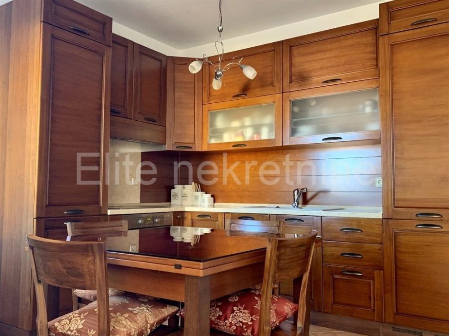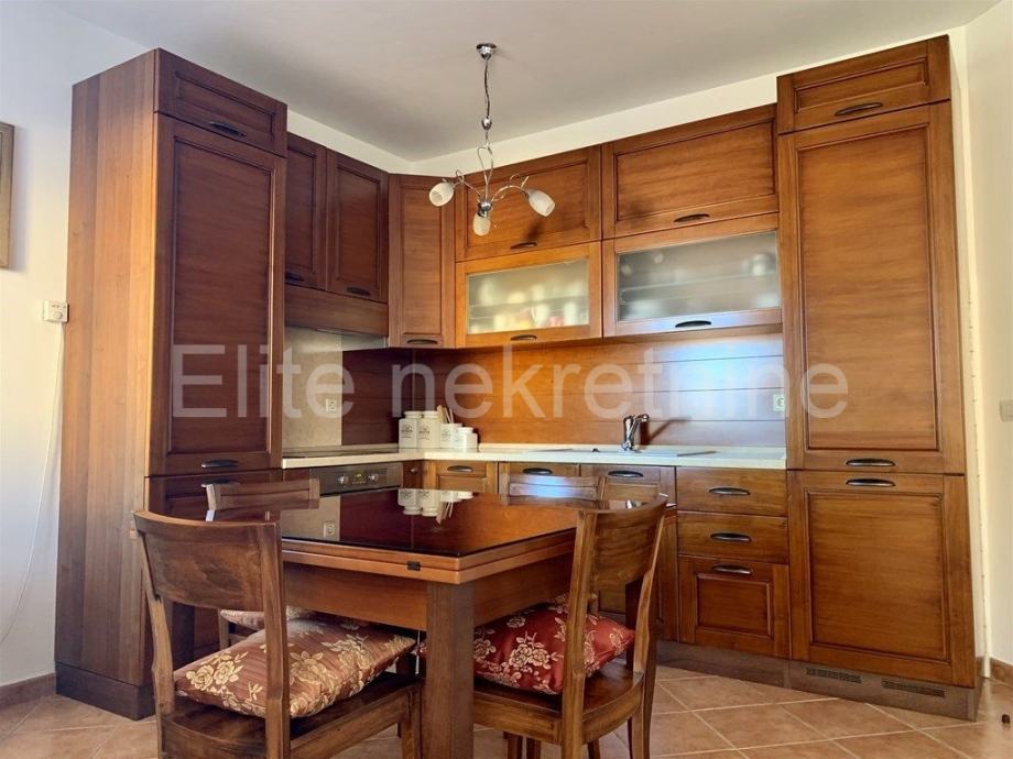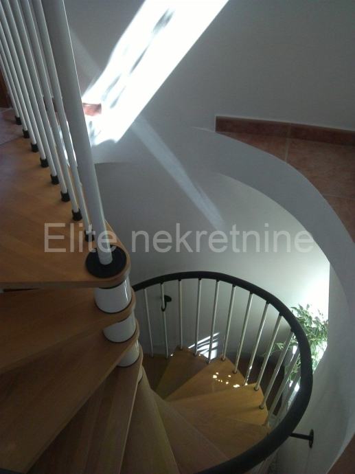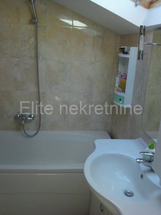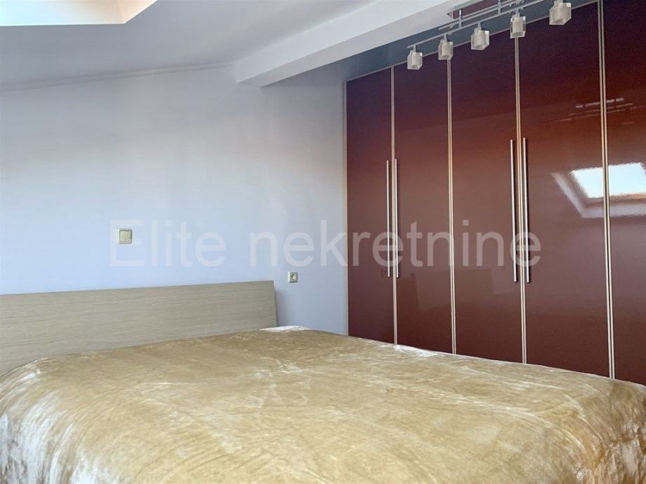 Dvoetažni stan nalazi se na drugom katu, kat+potkrovlje sastoji se od kuhinje, blagovaone i dnevnog boravka odnosno jedne otvorene prostrane prostorije, ostave, kupaone , spavaće sobe ,balkona i predprostora. Na gornjoj etaži se nalazi još jedna spavaća soba, radna prostorija i kupaona. Kupaone imaju tuš kabinu i tuš kadu.