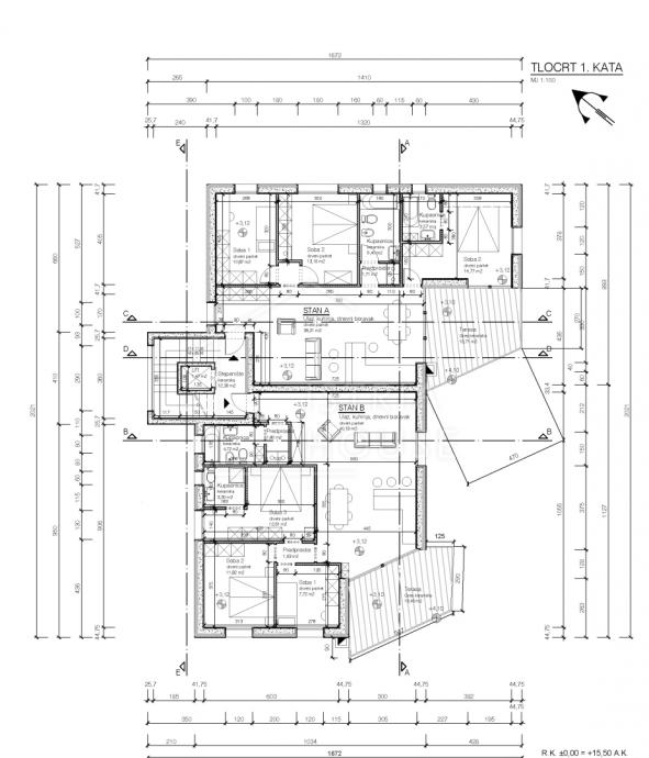 Nekretnina se nalazi na prvom katu zgrade te je ukupne stambene površine 110m2. Sastoji se od ulaznog hodnika, dnevnog boravka spojenog s kuhinjom i blagovaonicom, tri spavaće sobe, 2 kupaone i natkrivene terase od 16m2 iz koje imati ćete predivan pogled na more.