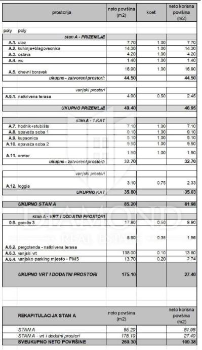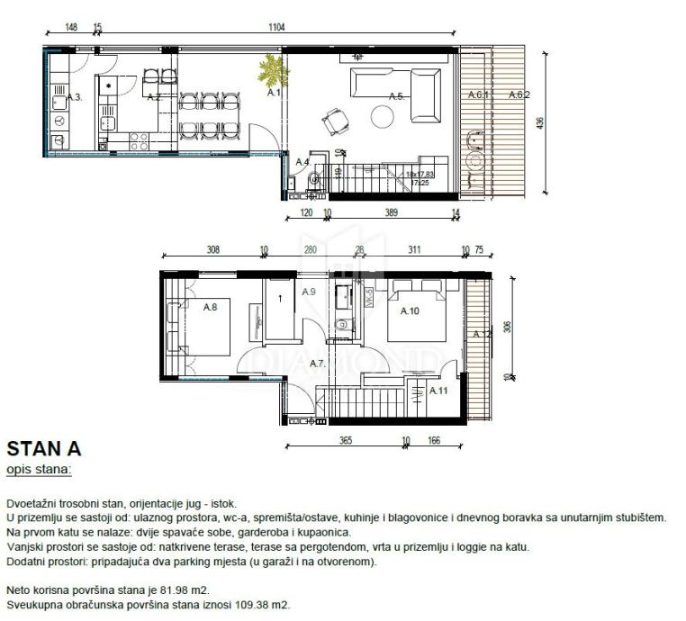 Ovaj stan ukupne korisne površine od 109.38m2 u koji se ubraja vanjsko parkirno mjesto kao i garaža te prostrani vrt površine proteže se na dvije etaže. U prizemlju stana dominira prostor open space koncepta koji se sastoji od ulaznog dijela, gostinjskog wc-a, dnevnog boravka, blagovaonice i kuhinje kroz koju se ulazi u spremište. Izlaz na okućnicu osmišljen preko staklene stijene koja se nalazi u boravku dok na prvi kat ovog stana vodi stepenište koje je diskretno ukomponirano u dizajn dnevnog boravaka. Na gornjoj etaži nalaze se još dvije spavaće sobe od kojih glavna ima i walk-in ormar te jedna kupaonica. Stambena površina ovog stana iznosi 81.98m2.