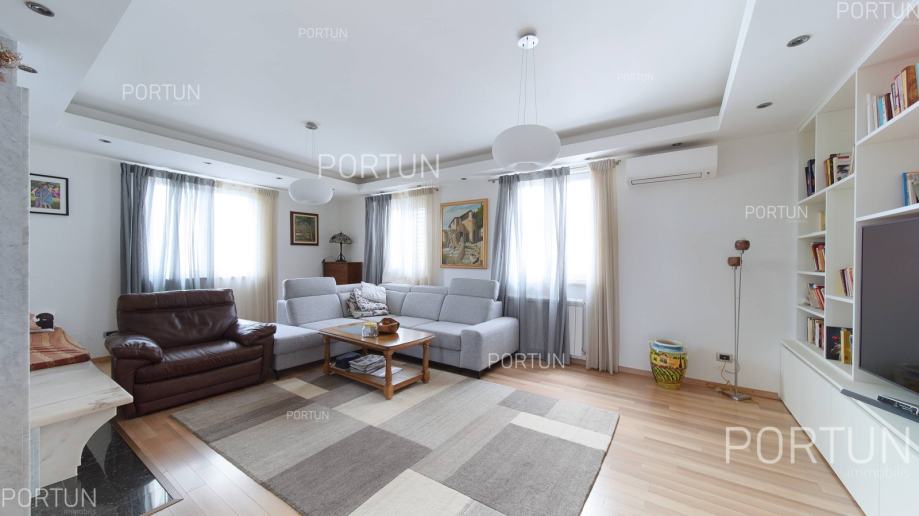 Bogato opremljen gradski stan na prvom katu manje zgrade pored tri spavaće sobe i ogromnog dnevnog boravka raspolaže s gotovo 90 četvornih metara pomoćnih prostorija u prizemlju. Stanu, površine 146 m2, naime pripada dvostruka garaža koja je spojena s spremištem, a u produžetku se nalazi kotlovnica. Pomoćne prostorije su visoke i dobro osvijetljene te se mogu po potrebi koristiti za obavljanje neke tihe djelatnosti.