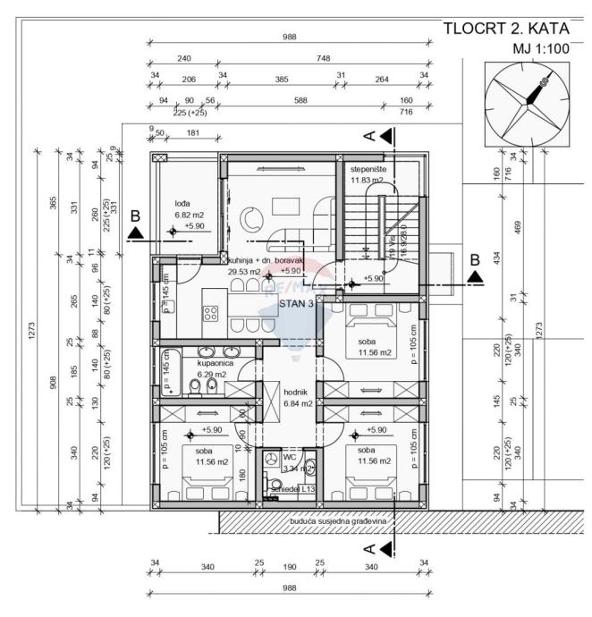 Stan koji broji ukupno 88m2 korisne površine sastoji se od 3 prostrane spavaće sobe,velikog dnevnog boravka s kuhinjom i izlazom na lođu,kupatila još jednog dodatnog sanitarnog čvora,