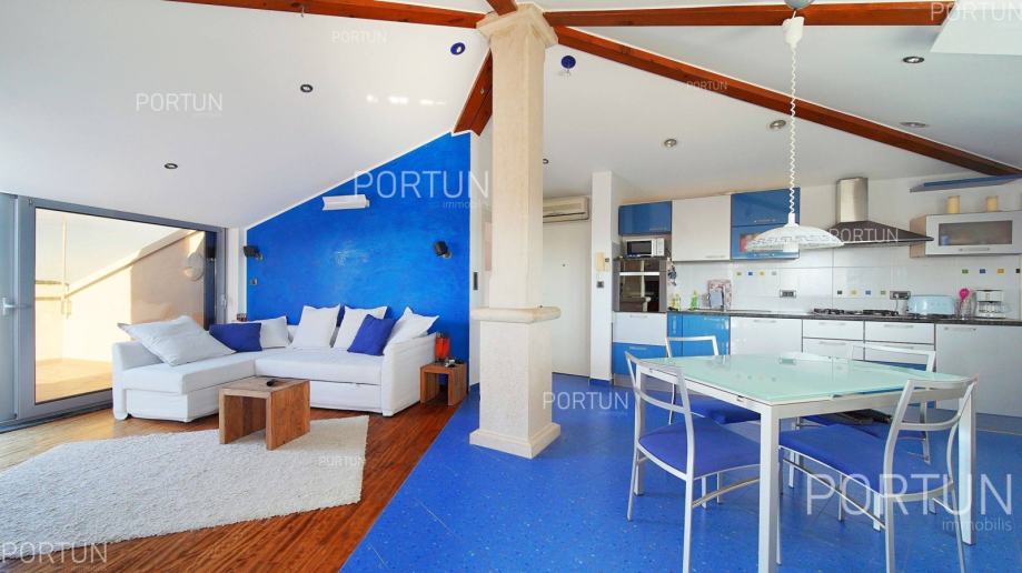 Atraktivan stan s dvije prostrane spavaće sobe i elegantnom kupaonicom, smješten je u jednom od najpoželjnijih dijelova Rovinja, a očarat će vas nevjerojatnim pogledom na more i pitoreskni stari grad. Ovaj stan zauzima vrhunsku poziciju na najvišoj etaži moderne stambene zgrade, nudeći udobnost i ekskluzivnost. Sastoji se od prostranog dnevnog boravka s kupaonicom, dvije prozračne spavaće sobe, jedne kupaonice i ugodne terase. Uz to, stanu pripada i parkirno mjesto u dvorištu te praktično spremište u podrumu. Izuzetno je opremljen modernim namještajem, odličnim kuhinjskim aparatima te visokokvalitetnom PVC i aluminijskom stolarijom. Za udobnost tijekom svih godišnjih doba, osigurani su dva klima uređaja za grijanje i hlađenje, a po želji, moguće je instalirati i peć na kruta goriva. Lokacija ovog stana je izuzetno praktična - u blizini su kafići, restorani, škole i sportski tereni, pružajući dinamičan i aktivan životni stil. Plaža je udaljena samo 900 metara, dok stari grad Rovinj leži na udobnih 1.3 kilometara. KLJUČNE OSOBINE✔ 2 Spavaće sobe | 1 Kupaonica✔ Pogled na more✔ Plaža 900 m ✔ E. Certifikat A✔ Izgrađeno 2004. g.✔ Etažni elaborat