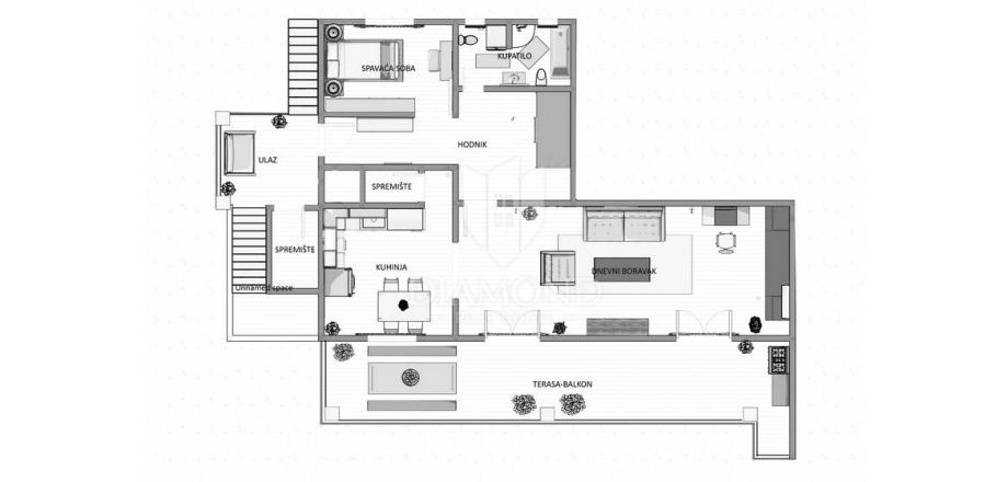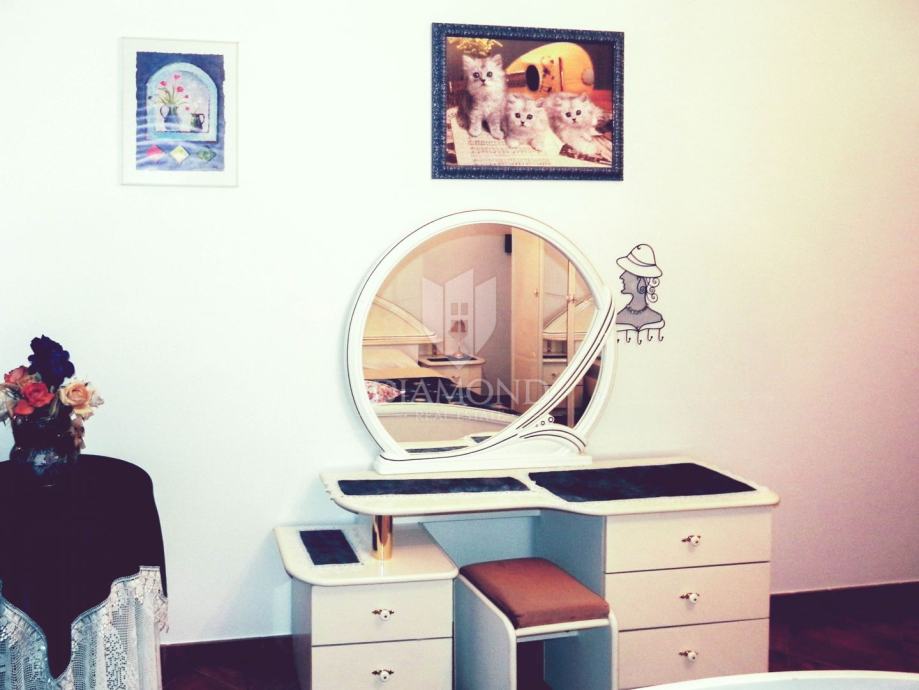 Ovaj dvosobni stan prostire se na prvom katu kuće i nudi ukupno 126 m2 stambenog prostora. Prostrani dnevni boravak povezan je s kuhinjom i blagovaonicom, stvarajući ugodan otvoreni prostor koji je idealan za svakodnevni život i zabavu. Veliko kupatilo i zaseban WC pružaju praktičnost, dok je ostava iza kuhinje savršeno mjesto za dodatnu pohranu. Stan također uključuje izlaz na natkrivenu terasu od 26 m2 s pogledom na vrt, idealno mjesto za opuštanje na otvorenom. Dodatna terasa od 7 m2 okrenuta prema prednjoj strani zgrade pruža dodatni prostor za uživanje u jutarnjoj kavi ili večernjem opuštanju. Centralno grijanje osigurava udobnost tijekom cijele godine, dok su sve potrebne infrastrukture (voda, struja, plin) već instalirane.