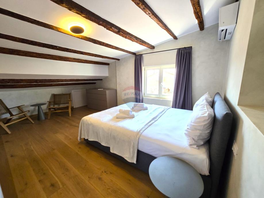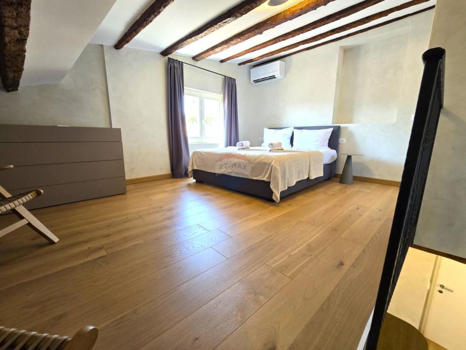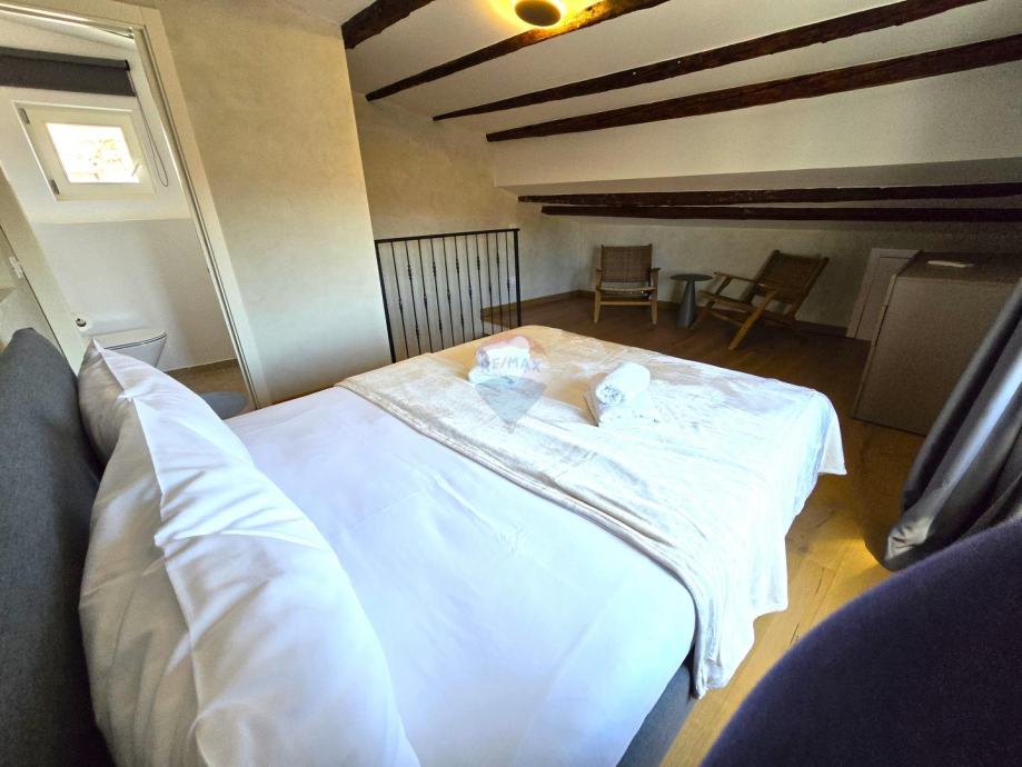 prostrana spavaća soba s panoramskim pogledom na stari grad i crkvu Sv.Eufemije i sanitarni čvor.