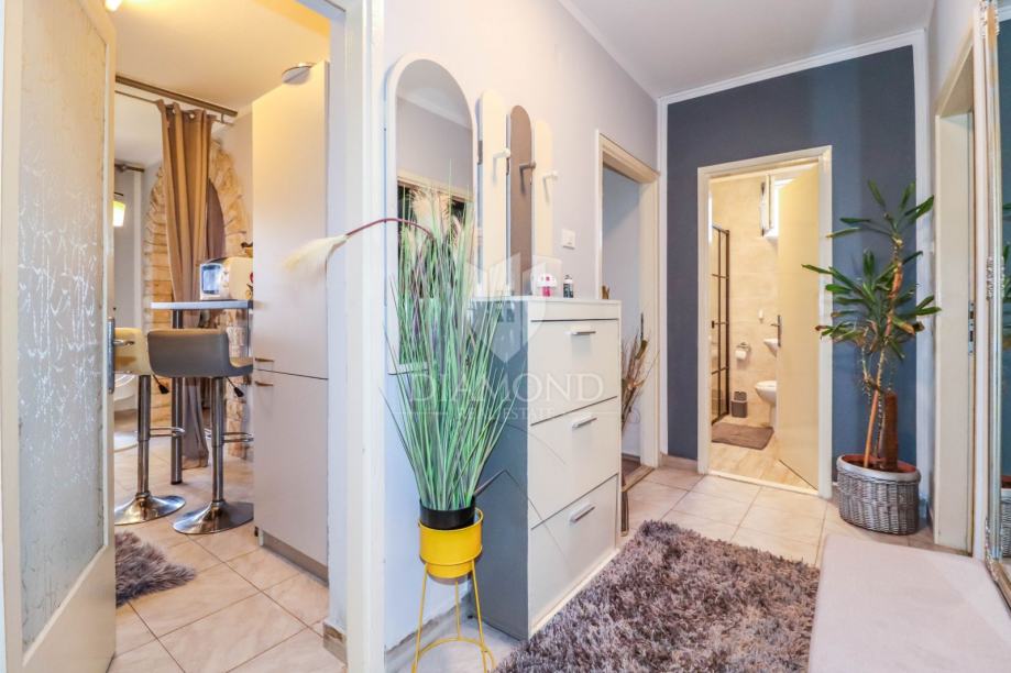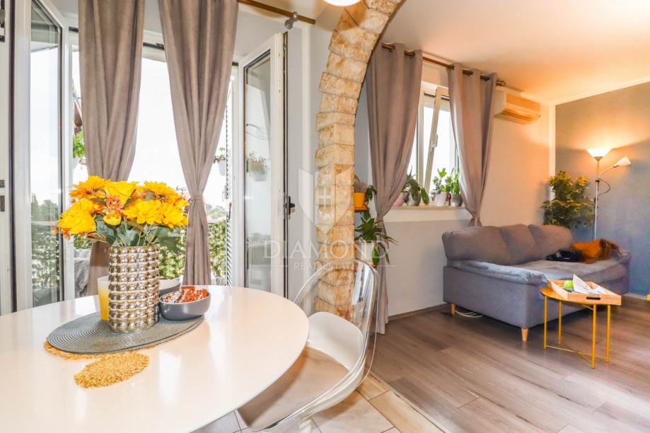 Stan se nalazi na petom katu višestambene zgrade u središtu Rovinja, što omogućuje impresivan pogled na grad i more s terase. Prostire se kroz funkcionalno raspoređene prostorije, uključujući ulazni hodnik koji stan dijeli na dnevni dio s dnevnim boravkom, blagovaonicom i kuhinjom, te na spavaći dio koji obuhvaća dvije spavaće sobe i kupaonicu. Takav raspored stanu daje dodatnu praktičnost i organiziranost. Stanu također pripada i spremište u podrumu zgrade, dok se parking nalazi u blizini.