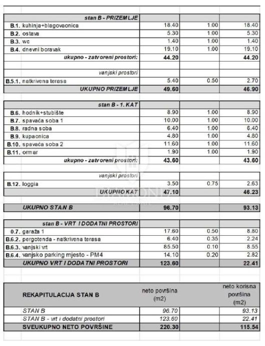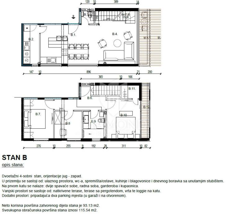 Ovaj stan ukupne korisne površine od 115,54m2 u koji se ubraja vanjsko parkirno mjesto kao i garaža te prostrani vrt površine proteže se na dvije etaže. U prizemlju stana dominira prostor open space koncepta koji se sastoji od ulaznog dijela, gostinjskog wc-a, dnevnog boravka, blagovaonice i kuhinje kroz koju se ulazi u spremište. Izlaz na okućnicu osmišljen preko staklene stijene koja se nalazi u boravku dok na prvi kat ovog stana vodi stepenište koje je diskretno ukomponirano u dizajn dnevnog boravaka. Na gornjoj etaži nalaze se još dvije spavaće sobe od kojih glavna ima i walk-in ormar, jedna radna soba te jedna kupaonica. Stambena površina ovog stana iznosi 93,13m2.