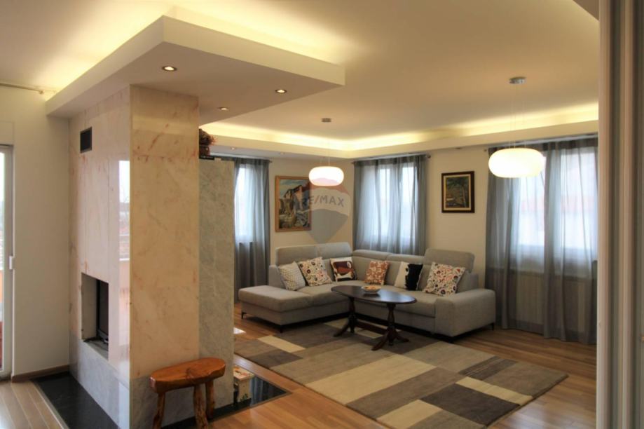 Površina stana je 146m2 I satoji se od ulaznog predprostora,vrlo velikog dnevnog boravka+terase,kuhinje+terase,špajze,jednog kupatila,jedne kupaone I 3 spavače sobe od kojih jedna ima svoju terasu.
