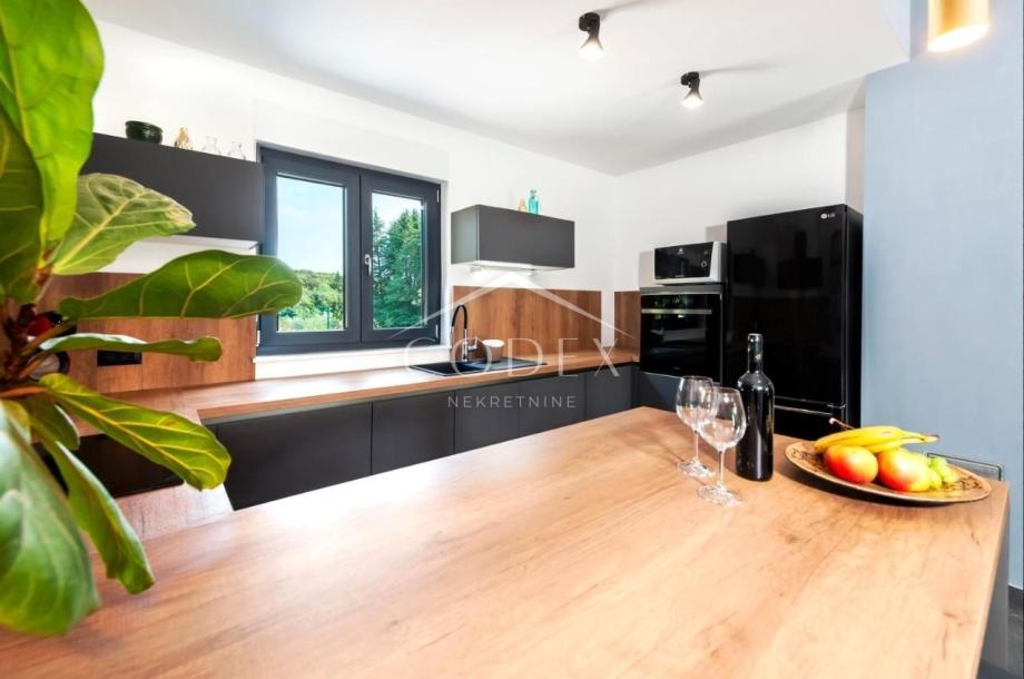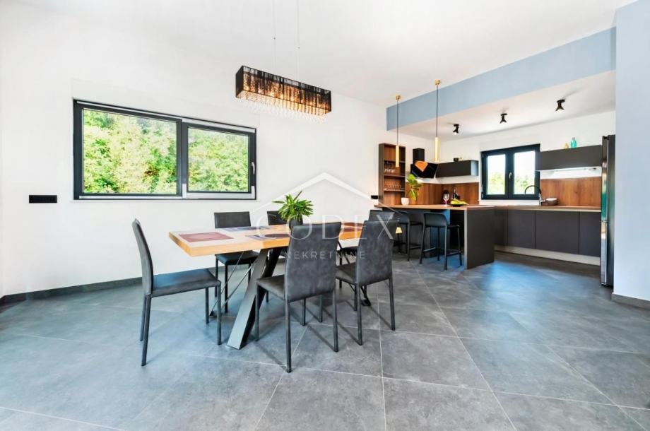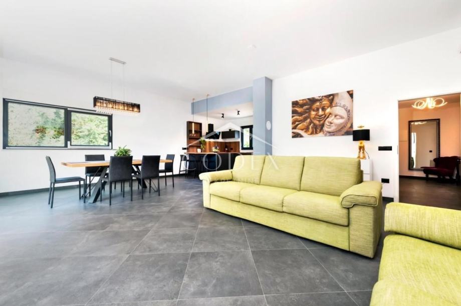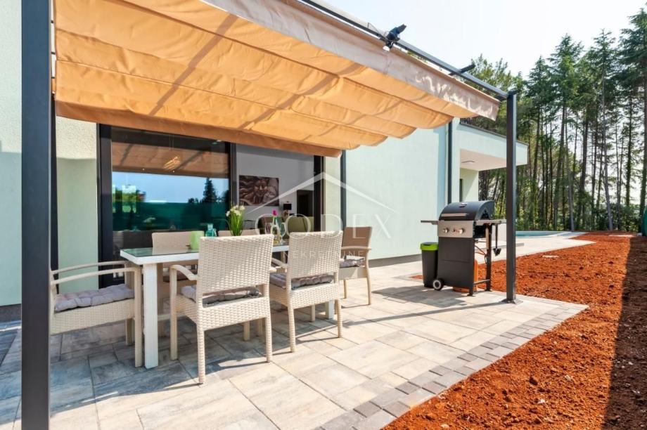 Prodaje se nova, moderna prizemnica, smještena na mirnom mjestu izvan gradske vreve, okružena borovom šumom, udaljena samo 500 m od plaža, te 2 km od samog centra Rovinja.