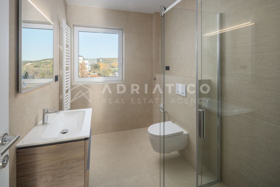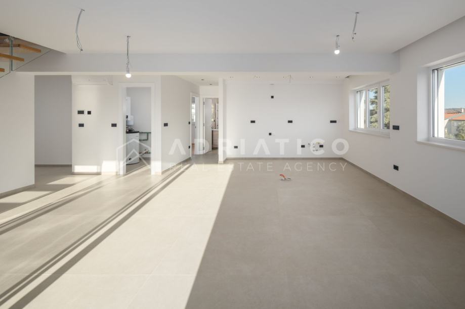 Na 1. etaži stana nalazi se open space dio u kojem se nalaze dnevni boravak i kuhinja s blagovaonicom iz kojeg se dolazi na veliki balkon a u drugom dijelu 1. etaže pronaći ćete 2 sobe i 2 kupaonice te manju prostoriju koja može poslužiti za razne namjene.