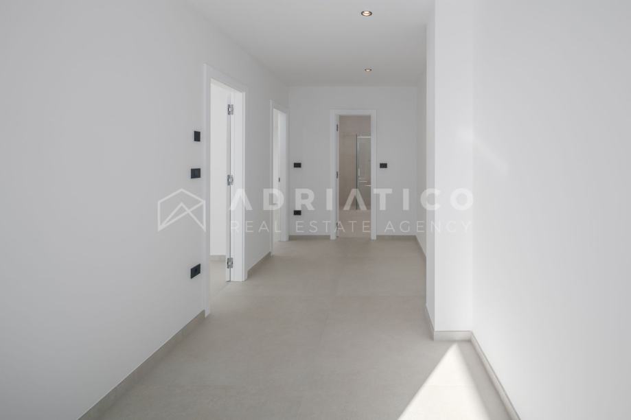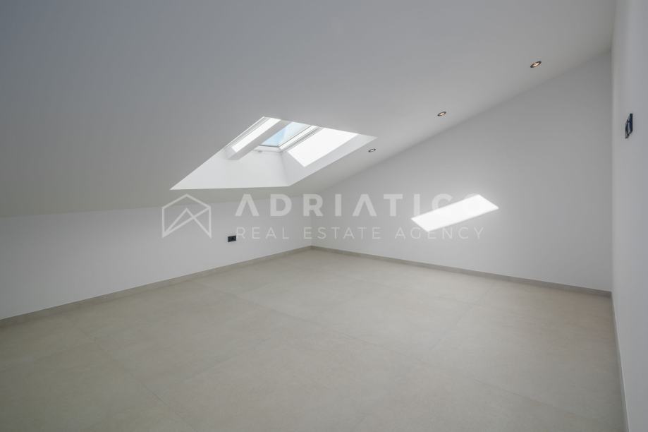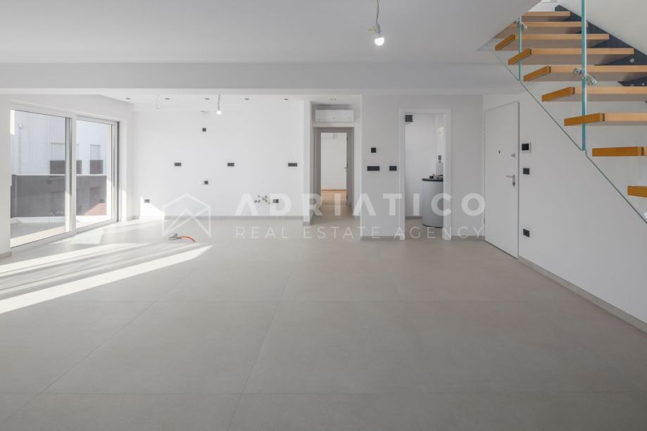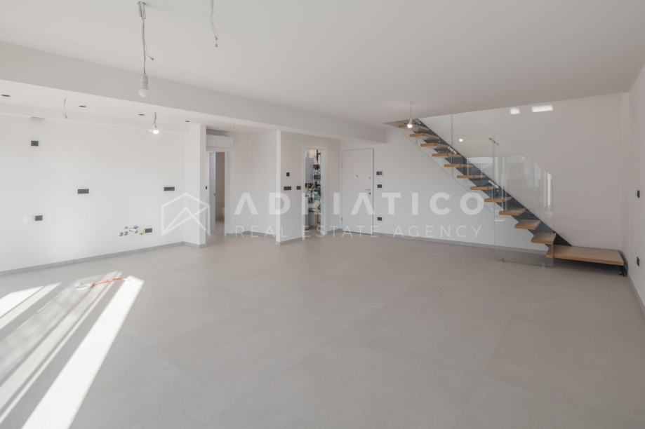 Na 1. etaži stana nalazi se open space dio u kojem se nalaze dnevni boravak i kuhinja s blagovaonicom iz kojeg se dolazi na veliki balkon a u drugom dijelu 1. etaže pronaći ćete 2 sobe i 2 kupaonice te manju prostoriju koja može poslužiti za razne namjene.
