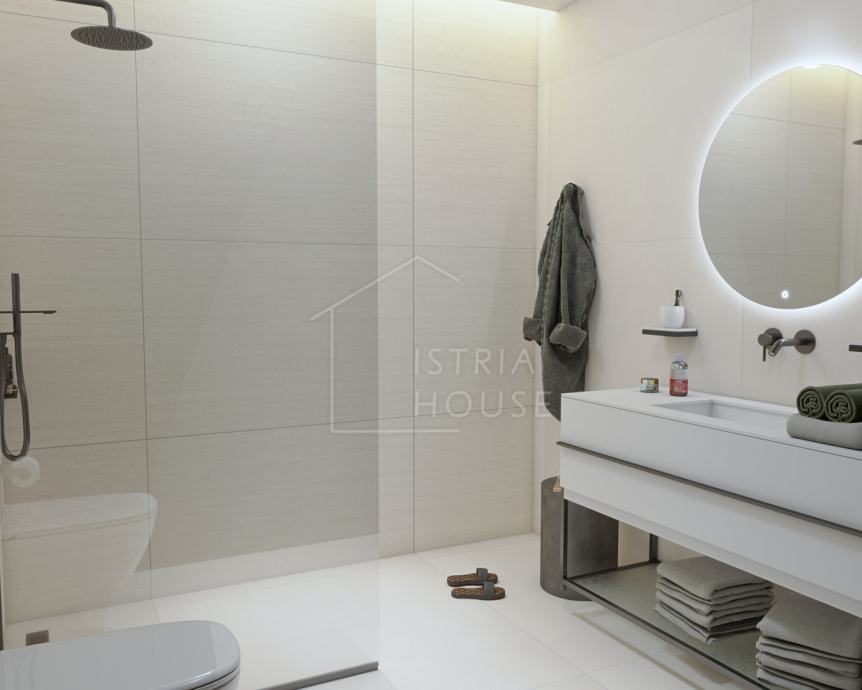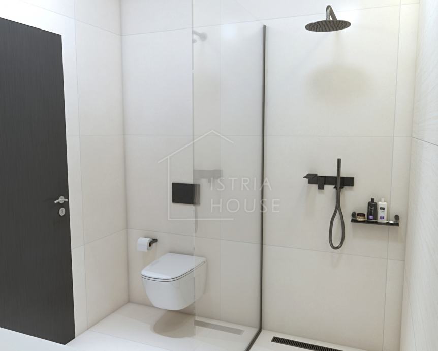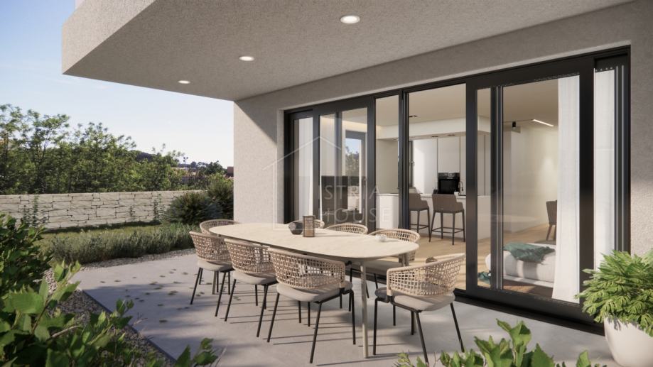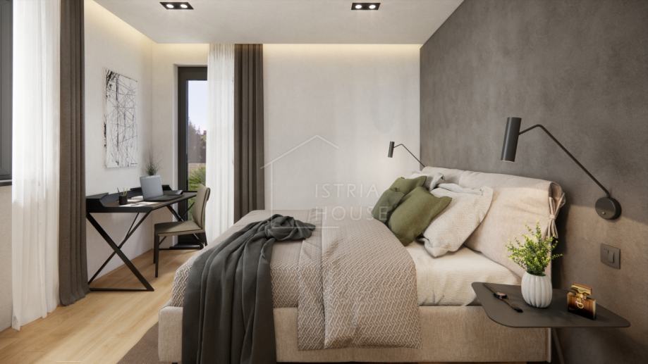 sobe, svaka sa svojom kupaonicom i garderobom. Kuhinja , blagavaona i dnevni boravak čine jednu prostoriju okrenutu prema vanjskoj svjetlosti, odnosno prema terasi i prema vrtu koji pripada stanu. Stan ima još gostinjski wc, garažu, ostavu te vanjsko parkirno mjesto.